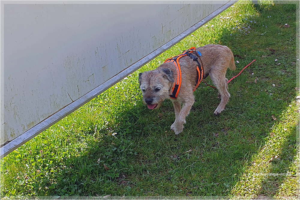 | Warten auf Herrchen, der mit Kinderwagen auf dem puckeligen Untergrund ziemlich langsam ist | ||