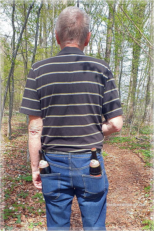 | Flaschen im Wald gefunden. Friedbert betätigt sich als Müllabfuhr. |