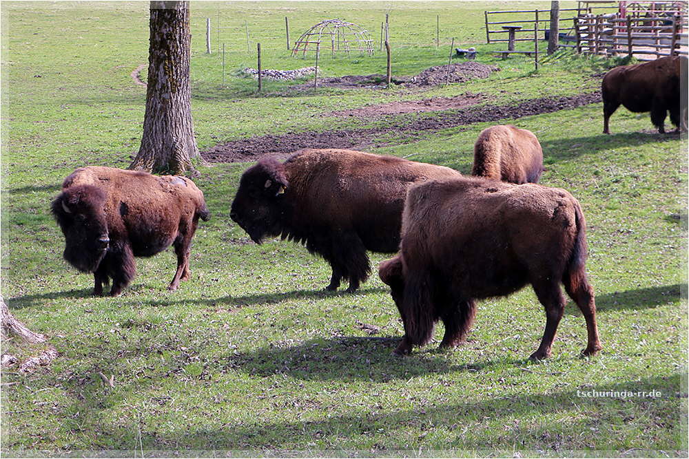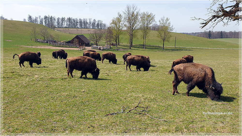 Am Vormittag geht es zum Bodanrück, wo wir mit Ruth die Bisons der Bisonzucht Bodenwald besuchen wollen und wir haben Glück. Die Herde hat wohl ihr Nachtlager noch nicht lange verlassen und steht grasend ganz in der Nähe des Weges. Nachdem wir uns lange die Tiere angesehen haben, laufen wir einmal rund um das Gehege, was im Tempo von Ruth und zwei Picknickpause für die Maus schon einige Zeit dauert. Wir fahren zurück nach Nenzingen, laden die Hunde im Womo ab und düsen dann zum Einkaufen nach Stockach. Sobald wir zurück sind, mache ich für heute Abend noch ein "Schnelles Zwiebelbrot" im Omnia, denn es steht noch mal Grillen auf dem Plan. Gestern ist doch einiges übrig geblieben und das Wetter ist auch noch gut vorher gesagt. Drinnen kochen können wir ja noch, wenn es wieder schlechter wird. |