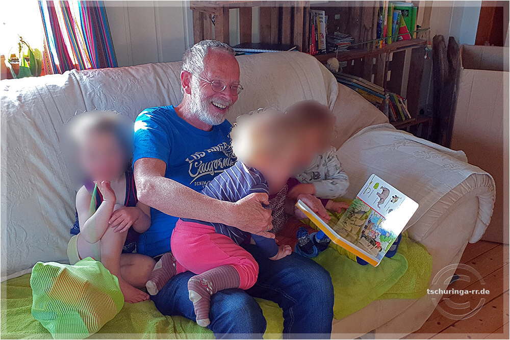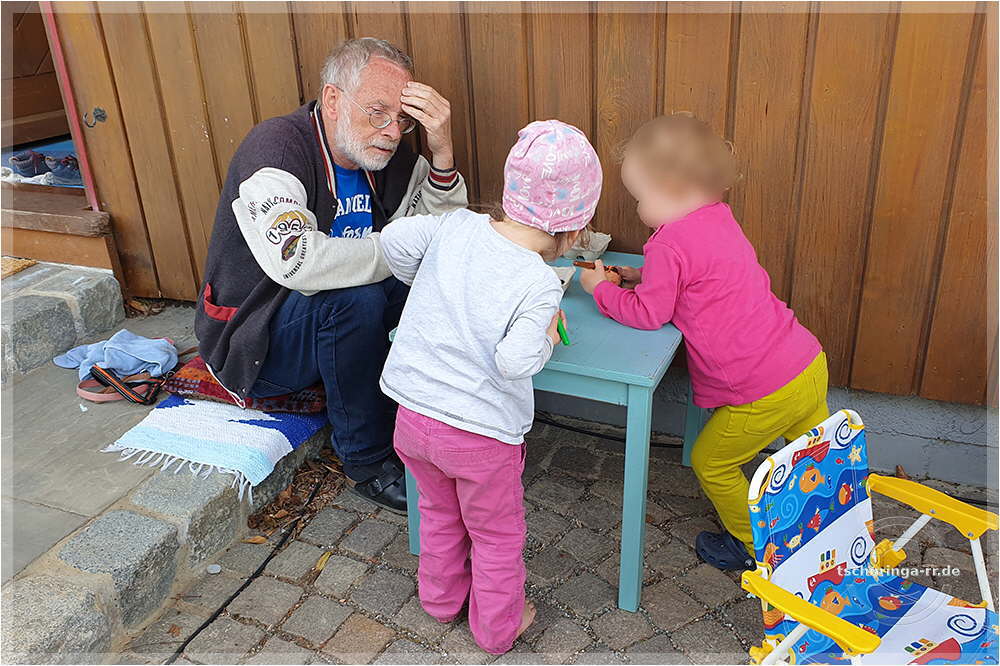 Vormittags kümmert sich Friedbert um Rieke und Ruben. Nachmittags laufen wir mit den Hunden oder verweilen im Wohnmobil, weil absolutes Mistwetter ist. Abends essen wir gemeinsam und lassen den Abend dann ausklingen. Sonst gibt es nicht wirklich viel zu berichten. Am Samstagnachmittag kommt unsere jüngere Tochter Alexandra mit ihrem Mann René und den Kindern Ruth und Karl. Jetzt ist die Hütte voll und mit vier Kindern zwischen drei Jahren und einem dreiviertel Jahr richtig was los. |