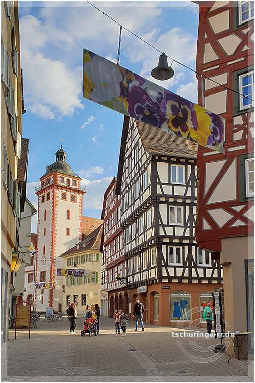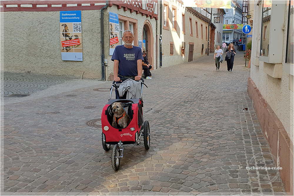 Da wir ja gestern schon einiges vorbereitet haben, sind wir heute Morgen zeitig unterwegs, um nach drei Kilometern schon wieder anzuhalten, denn das TireMoni Reifendruckkontrollsystem meckert, dass auf dem rechten Reifen des Anhängers zu wenig Luft ist. Also halten wir an der Biogas Anlage schon wieder an und pumpen ihn mit dem Kompressor auf. Nach gut 190 Kilometer, Gas tanken und Einkaufen kommen wir in Mosbach auf dem Stellplatz an. Es gibt nur einen einzigen Platz auf dem wir mit Anhänger stehen können, aber der ist direkt vor hohen Bäumen. An allen anderen Tagen wäre das kein Problem, aber Dienstag ist der einzige Tag an dem wir fernsehen wollen. Also koppeln wir den Anhänger ab, stellen ihn am Rande des Stellplatzes ab und beziehen den letzten Platz in der Reihe. Mittagessen gibt es draußen in der Sonne. Danach spazieren wir entlang der Elz. Als wir zurück kommen ist noch recht früh und wir entscheiden, dass wir den Anhänger für Yukon aufbauen und heute mal Sightseeing in Mosbach machen. Ein schönes Städtchen mit alten Fachwerkhäusern. |