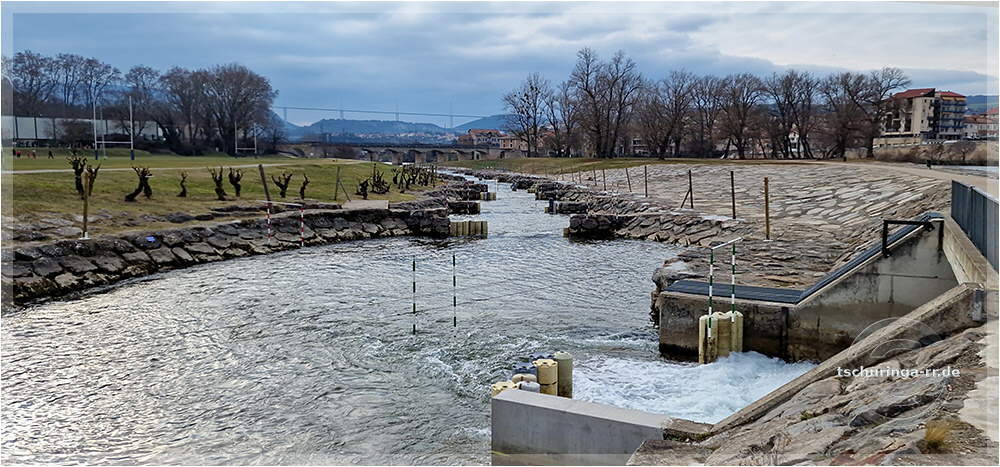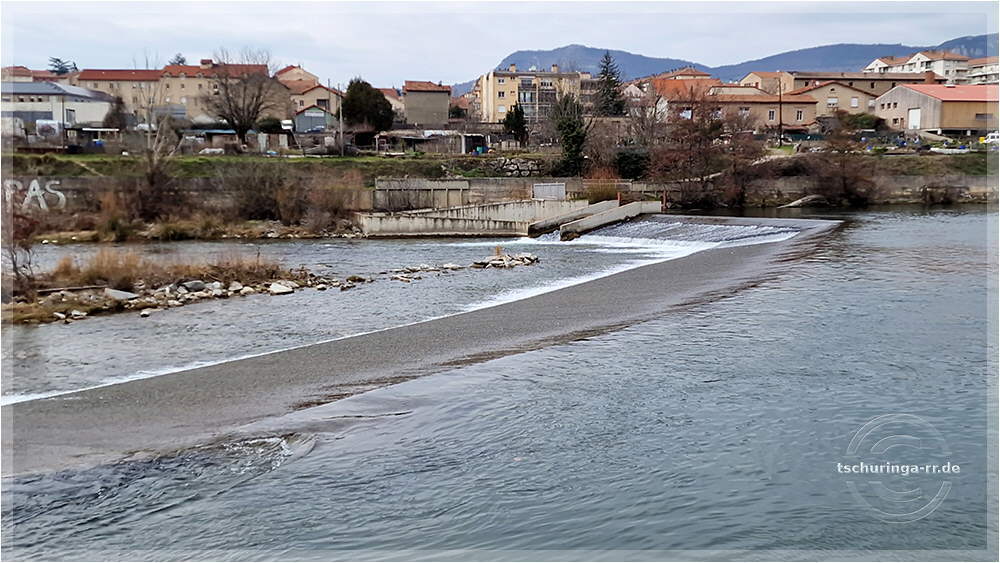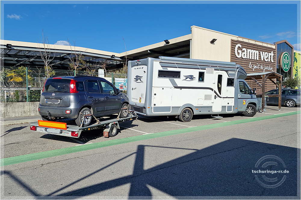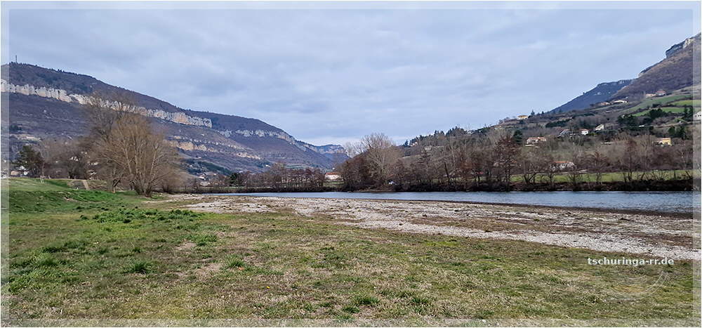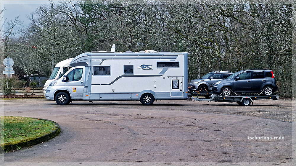 Die Nacht war nicht wirklich erholsam. Es ist wieder erheblich stürmischer und die Böen um die 85 km/h schütteln das Wohnmobil ganz ordentlich durch. Der Wind treibt durch die Zwangsbelüftungen der Dachluken und rappelt an den Verdunkelungen. Wir sind früh auf und nach Ver- und Entsorung fahre ich den Panda hinter Womo und Anhänger her. Einkaufen, Gas, Diesel und für 1,50 € Luft tanken Nachdem der Luftdruck beim Trailer wieder passt, laden wir auf einem unbebauten Grundstück den Panda auf. Dann geht es weiter nach Mourèze. Eigentlich wollen wir dort wandern, aber der Stellplatz ist so gar nicht nach unserem Geschmack. Der Untergrund ist hart und sandig, der Stellplatz völlig schief und die Entsorgung, die es geben soll, ist auch nicht (mehr?) vorhanden. Wir entscheiden uns zur Weiterfahrt und nach der Mittagspause geht es noch 89 km nach Millau, wo wir mit dem ganzen Gespann ein Plätzchen finden. Anschließend geht es mit den Hunden los. Auf der anderen Straßenseite ist ein Park entlang des Flusses Tarn. So laufen wir bis wir zu einer Straße kommen und die Wiese neben dem Weg für Yukon nicht mehr vorhanden ist. Von da aus geht es zurück und wir machen es uns im Womo gemütlich. |