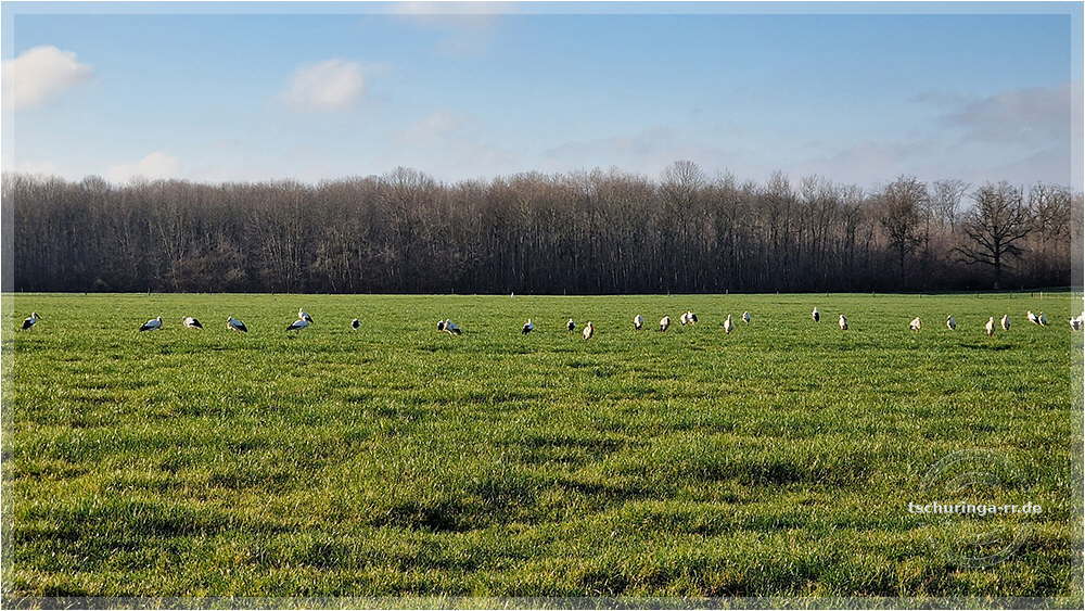 | Kurz nach der Abfahrt sehen wir auf einer Wiese neben der Straße diese Weißstörche. Es sind fast 40 Tiere. | ||