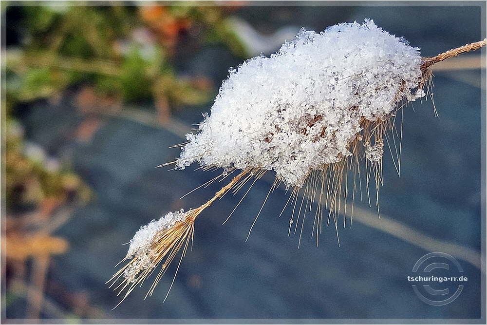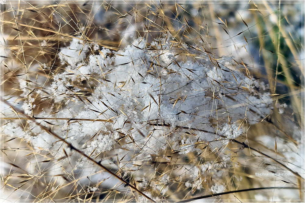 | Der leichte Schnee liegt zwischen den feinen Gräsern | ||