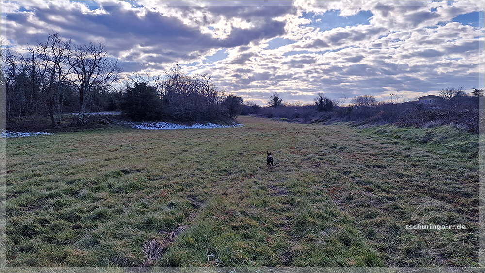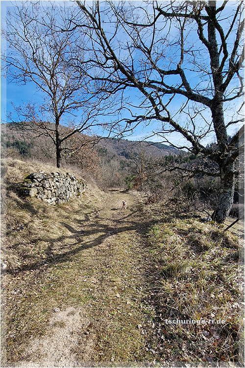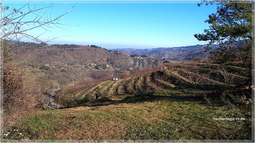 Wir haben uns nur knapp 90 Kilometer vorgenommen, denn Corona sorgt immer noch für etwas "Schlappheit". In Ruoms kaufen wir beim SuperU ein. Vor allem brauchen wir eine Matte, um sie vor die Eingangstür zu legen. Irgendwie ist keine mitgekommen. Das Navi scheint auch an Corona zu leiden und will uns zum Stellplatz erst durch eine enge Gasse und dann über den Pausenhof einer Schule schicken. Da es keine Möglichkeit gibt zu drehen, muss Friedbert das Gespann zurücksetzen, bis wir wieder unten auf der Straße sind. An der Kreuzung ist ein Brunnen an dem "Eau de Potable" steht, also Trinkwasser. Wir nutzen die Gelegenheit und füllen unseren Wassertank auf, denn die Zapfstellen auf den Stellplätzen sind alle wegen des Frostgefahr abgestellt. Den Stellplatz in Fons-sur-Lussan erreichen wir dann doch noch über die ganz normale Straße und laden den Panda ab, denn hier können wir nicht mit dem angehängten Trailer stehen. Macht aber nichts, wir wollen sowieso zwei oder drei Tage bleiben und eine Corona Erholungszeit einlegen. Nachmittags laufen wir noch eine schöne Runde, die sogar zum großen Teil für Yukon richtig klasse ist und er auch Freilauf genießen kann. Abends telefonieren wir noch lange mit Alexandra und René. |