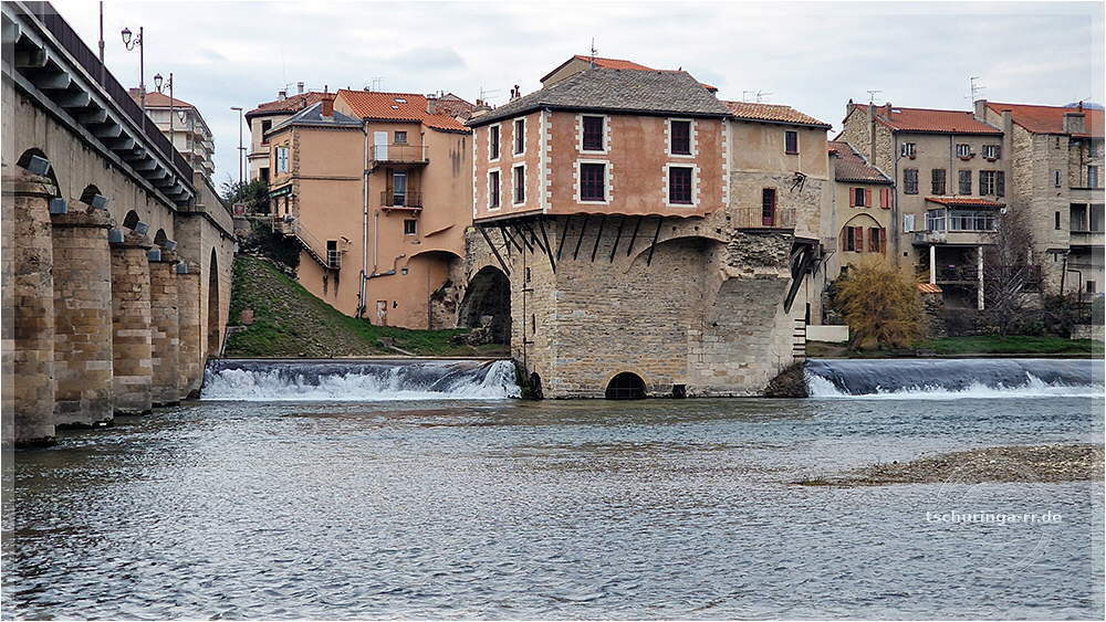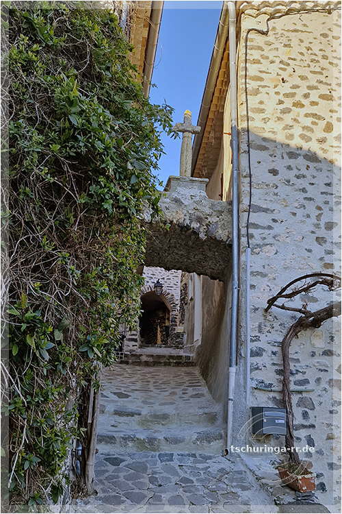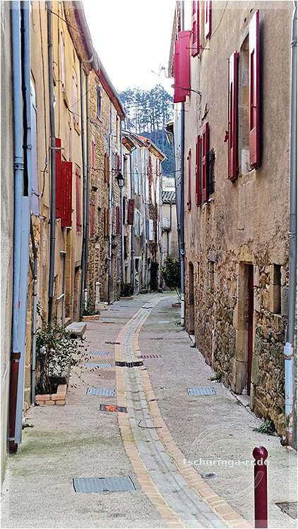 Keine Sonne, alles grau und trübe, aber kein Regen. Nach dem Entsorgen wird der Anhänger angekoppelt und es geht bis Lieuran-Les-Beziers zum Einkaufen. Nächste Station: Gas tanken. Diesel tanken wird heute nichts. Die erste Tanke hat um 4 Cent erhöht. Nö, so nötig haben wir es nicht. Die nächste ist richtig günstig, will keine der drei Karten, die Friedbert im Angebot hat. Also gibt es heute keinen Diesel. Nicht weiter schlimm, im Tank ist noch genug drin. Gegen 13:00 Uhr kommen wir am Stellplatz in Villesèque-des-Corbières an. Wir koppeln den Anhänger mitsamt Panda drauf außerhalb des Stellplatzes ab und lassen ihn am Wegesrand stehen, da wir uns noch nicht sicher sind, wie es weitergeht. Nach der Mittagspause peilen wir erst einmal die Lage. Viel Möglichkeiten für Yukon zu laufen gibt es nicht. Also holen wir den Fahrradanhänger raus und Yukon wird kutschiert. So können wir eine kleine Stadtbesichtigung starten. |