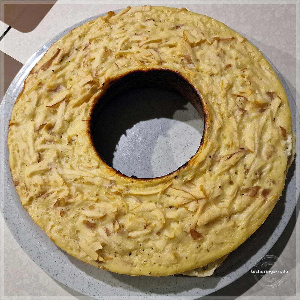 | Vier Äpfel hatten es mehr als nötig. Also Pfannkuchenteig gemacht, die Äpfel dran geraffelt, alles in den Omnia und eine Stunde auf kleinster Flamme gebacken. Legga war's. | ||