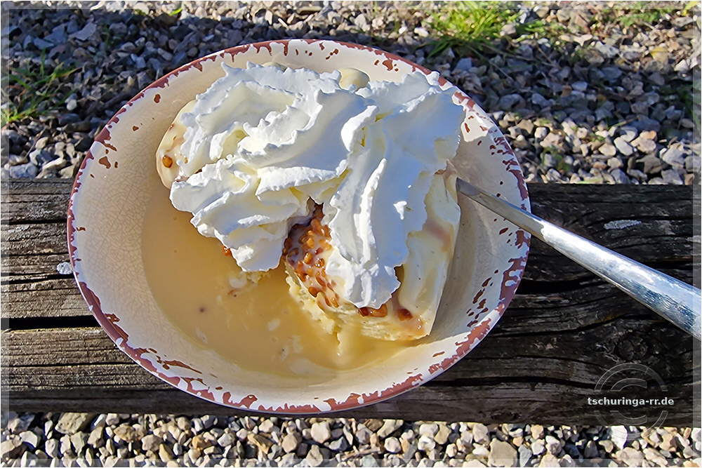 Wir haben kein Brot mehr, weil ich gestern vergessen habe, welches zu backen. Friedbert geht vor dem Frühstück zu dem kleinen Supermarkt und kauft zwei Baguettes und noch eine Packung Galettes, denn die sind RICHTIG lecker. Ich bereite den Brotteig vor und während das im Omnia geht, mache ich den "Mexikanischen Bohneneintopf" für heute Abend fertig, denn der soll laut Rezept noch durchziehen. So hat der auf jeden Fall genug Zeit. Nach dem Mittagessen brechen wir zu einer kleinen Wanderung auf. Der Einfachheit halber laufen wir die gleiche Runde wie gestern, nur in die andere Richtung. Da tun sich uns gleich ganz neue Ausblick auf. Nach der Rückkehr füllen wir den Frischwasservorrat auf. Bei Cappucino und Kaffee genießen wir vor dem Wohnmobil in herrlicher warmer Sonne einige Galettes, während wir mit Kilian telefonieren. Da das schöne Wetter noch bleiben soll, haben wir entschieden, dass auch wir noch bleiben. |