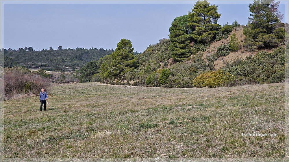 Am Vormittag starten wir zu einer Dorfbegehung. Fons-sur-Lussan hat knapp 250 Einwohner, das sind so viele wie in Katzenbach. Im Gegensatz zu unserem Dorf gibt es hier einen kleinen Supermarkt sowie eine Kirche, eine Schule und ein Rathaus. Wir bummeln mit Yukon im Fahrradanhänger durch die engen Gassen, finden den kleinen Laden und kaufen leckere Galettes und Käse und wandern noch ein kleines Stück über einen Feldweg bis der für Yukon zu steinig wird. Danach geht es zurück zum Wohnmobil, denn es ist inzwischen Mittagszeit. Später fahren wir ein paar Kilometer mit dem Auto zu einem Weg, den wir gestern gesehen haben und der pfotentechnisch vielversprechend aussah. Drei Kilometer laufen wir durch eine herrliche Gegend mit weitgehend weichem Untergrund. Yukon genießt viel Freilauf, während Lennox vorsichtshalber angeleint bleibt. Wer weiß was hier an Wild unterwegs ist? |