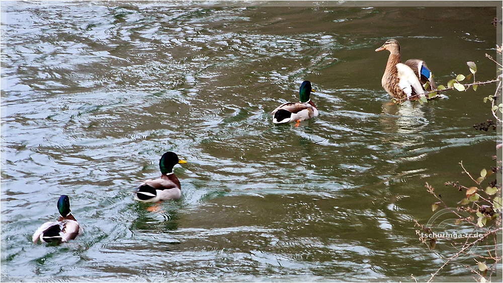 | Drei liebestolle Erpel und eine genervte Ente, die sich um ihre Brut dann auch noch alleine kümmern muss. Irgendwie unfair so ein Entenleben. | ||