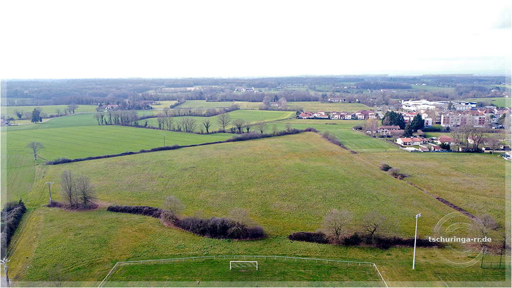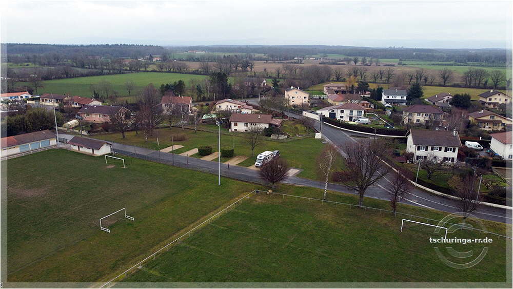 Der Tag meldet sich mit einem schönen Sonnenaufgang. Wir sind früh wach. Friedbert geht es etwas besser, aber fit ist anders. Nach Frühstück, Gassi und Entsorgen geht es los. Inzwischen hat sich der verheißungsvolle Morgen leider in ein diesiges Nieselwetter verwandelt. Die Strecke von 167 km fahre ich allein und nach etwa drei Stunden erreichen wir den Stellplatz in Saint-André-sur-Vieux-Jonc. Es regnet, also machen wir es uns im Wohnmobil gemütlich. Nach dem Mittagessen ist es dann trocken und ich hole mal "Nissi" (Die Drohne summt wie eine wildgewordene Hornisse Am frühen Nachittag kommt tatsächlich noch die Sonne zum Vorschein und wir starten zu einem kleinen Spaziergang rund um die Fußballfelder und über die große Wiese dahinter. Sonst gibt es hier leider nur für Yukon ungeeignete Straßen. Nach der Rückkehr packe ich noch mal die Drohne aus und hoffe auf ein paar Fotos bei Sonne, was auch so leidlich gelingt. |
