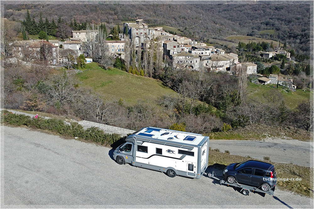 Es geht weiter südlich. Wir sind wieder so fit, dass wir weiter wollen. Friedbert fährt, damit ich noch etwas Ruhe habe. Nach einigen Stopps für Gas und Diesel tanken sowie Einkaufen kommen wir gegen 14:30 Uhr auf dem Stellplatz in Aubignas an. Der Ausblick vom Stellplatz auf den malerisch gelegenen Ort ist so toll, dass ich zuerst mal die Drohne in die Lüfte gehen lasse. Anschließend laufen wir eine kleine leider für Yukon recht blöde Runde. Friedbert muss ihn oft tragen, denn der Untergrund ist für den kleinen Mann so gar nicht geeignet. Zurück am Wohnmobil entscheiden wir, dass wir noch in den Ort wollen. Da der erst recht nichts für Yukon ist, haben wir zwei Optionen. Ihn im Womo zu lassen oder den Anhänger auszupacken und ihn darin mitzunehmen. Wir entscheiden uns für Letzteres. Und so schieben wir eine gute halbe Stunde später Richtung Ort. Yukon warm eingepackt, denn es ist recht kalt. Nach der Rückkehr rufen wir erst in Nenzingen und dann in Düsseldorf an. Denn heute haben unser Enkelsohn und unser Sohn Geburtstag. |