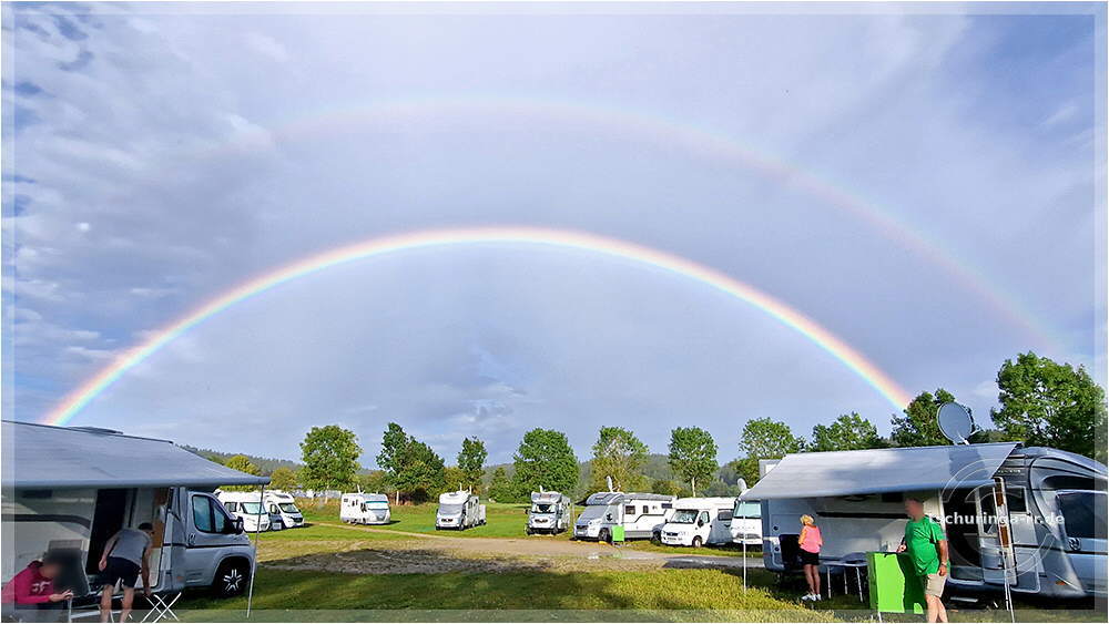 Die ersten zwei Laikas fahren heute schon wieder. Nicht alle sind Rentner und haben unbegrenzt Zeit und müssen auch noch einige Kilometer fahren. Nach den Verabschiedungen kehrt etwas Ruhe ein. Friedbert und ein paar andere besuchen noch mal die Therme. Das gemeinschaftliche Grillen fällt heute im wahrsten Sinne des Wortes ins Wasser. Ein paar Grüppchen finden sich zusammen und grillen unter den Markisen. Währendessen kommt schon wieder die Sonne raus und es gibt einen wirklich tollen Regenbogen über unseren Laikas.  |