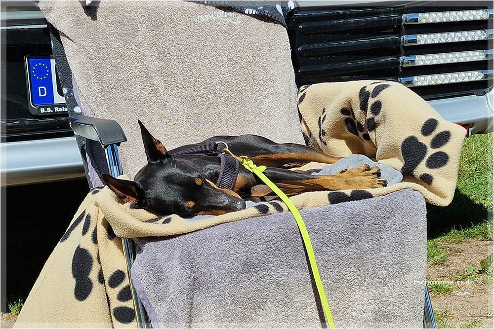 Der Anhänger ist schnell angehängt und ab geht die Post. Unterwegs noch schnell einkaufen. Das Gastanken fällt aus, weil die Tankstelle komplett wegen Wartungsarbeiten geschlossen ist. Macht aber nichts, wir haben noch einiges in Reserve. Am Zielort Dienville fahren wir auf den Stellplatz. Bei der Anfahrt stellen wir fast gleichzeitig fest: "Hier waren wir schon mal". Der Panda wird wieder abgeladen, der Trailer auf dem nahegelegenen Parkplatz verstaut, das Bärchen können wir neben dem Womo parken. Nach der Mittagspause mit leckerem Kuchen geht es zum Lac d'Amance. Am Strand ist Hundeverbot, was uns aber nicht stört. Sand ist sowieso nichts für Yukon. Wir bummeln bis zum Yachthafen, sitzen eine Weile auf der Bank und genießen das herrlich warme Wetter. Später nutze ich den Schatten der Bäume und trimme Yukon, denn der hinterlässt inzwischen schon einiges an Haaren im Womo und alles was ich runter hole, kann nicht mehr drinnen runterfallen.  |