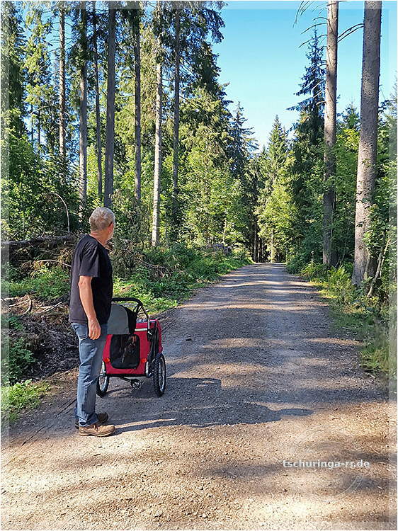 Es wird wieder warm. Während Friedbert zu Fuß im örtlichen Landhandel ein Brot besorgt, breche ich mit den Hunden im schön kühlen Wald zum Morgengassi auf. Im Anschluss daran verbringen wir den Tag mit kurzen Unterbrechungen vor dem Wohnmobil unter der Markise mit Sonnenschutz. Gegen 16:00 Uhr starten wir zu einem Spaziergang, in dessen Verlauf wir einen schönen Weg finden. Schattig und für Yukon super geeignet.  |