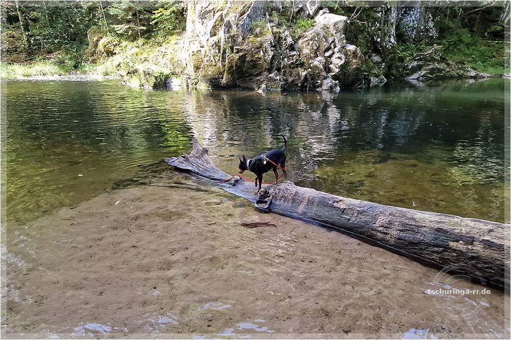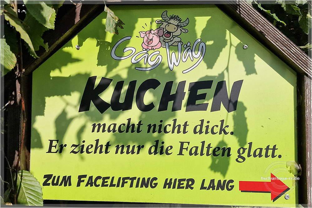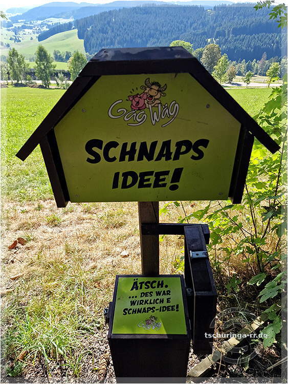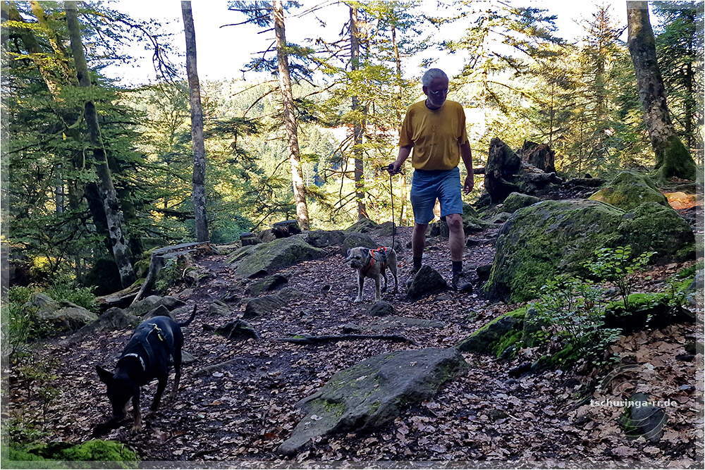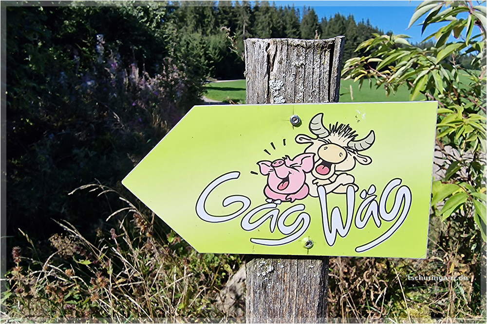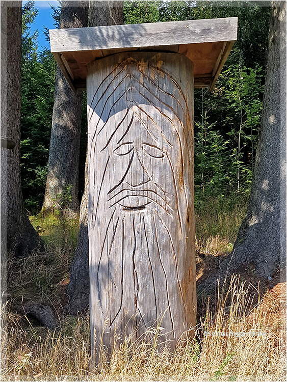 Nach dem Frühstück fahren wir zum Einkaufen nach Titisee-Neustadt. Morgens ist es noch kühl genug, so dass wir die Hunde im Womo lassen können. Nachmittags fahren wir ein paar Kilometer, denn wir wollen auf dem Gäg Wäg laufen. Ein Wanderweg mit einigen witzigen Sachen am Wegesrand. Der Untergrund ist sehr unterschiedlich. Deshalb nehmen wir für Yukon den Wagen mit.  |