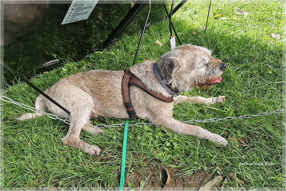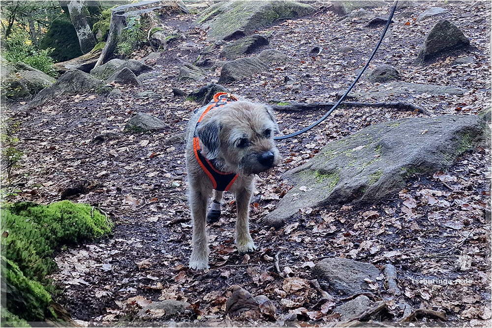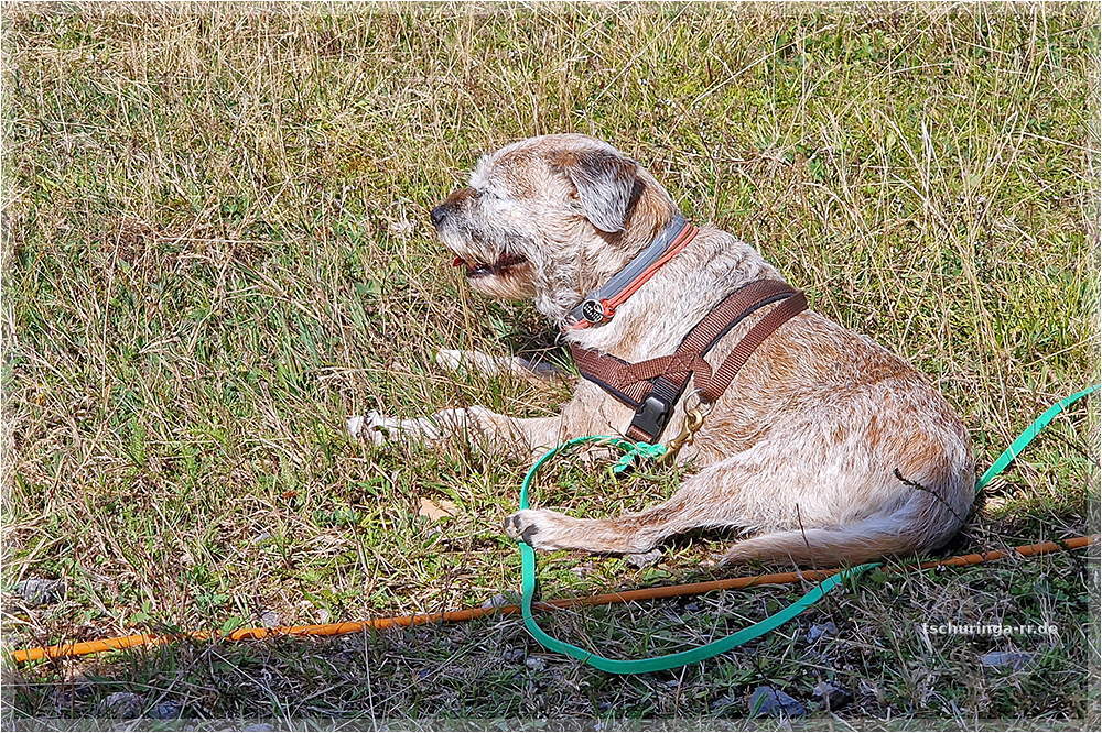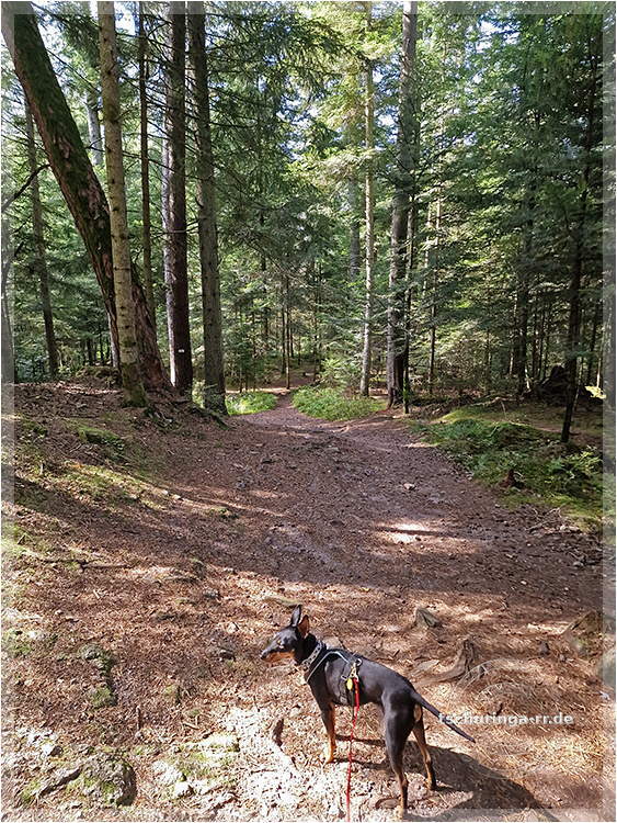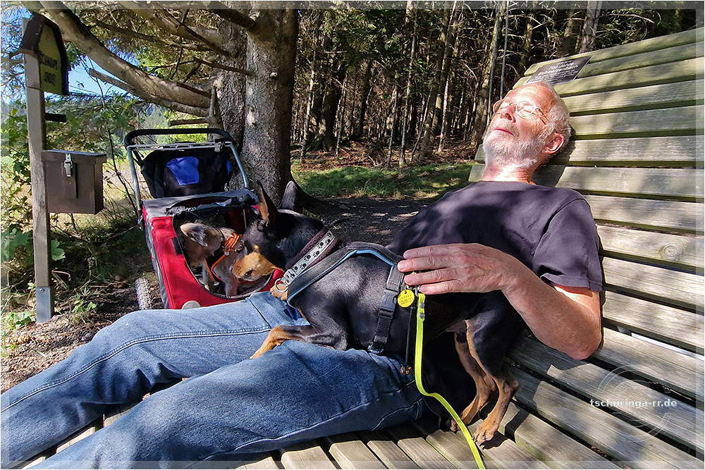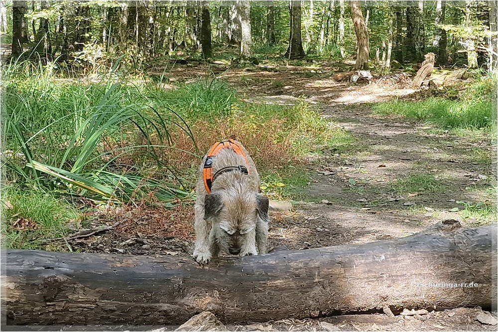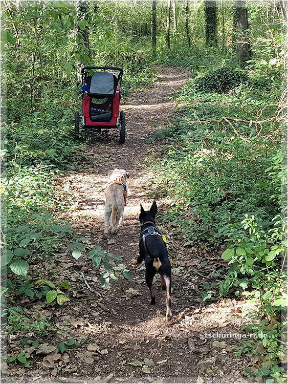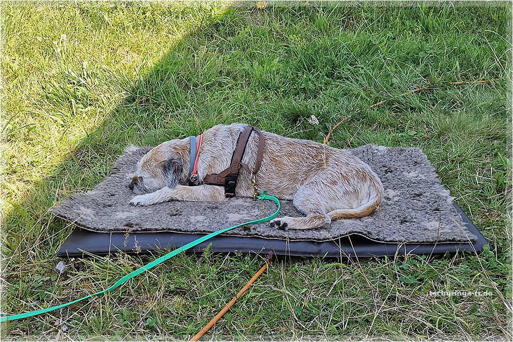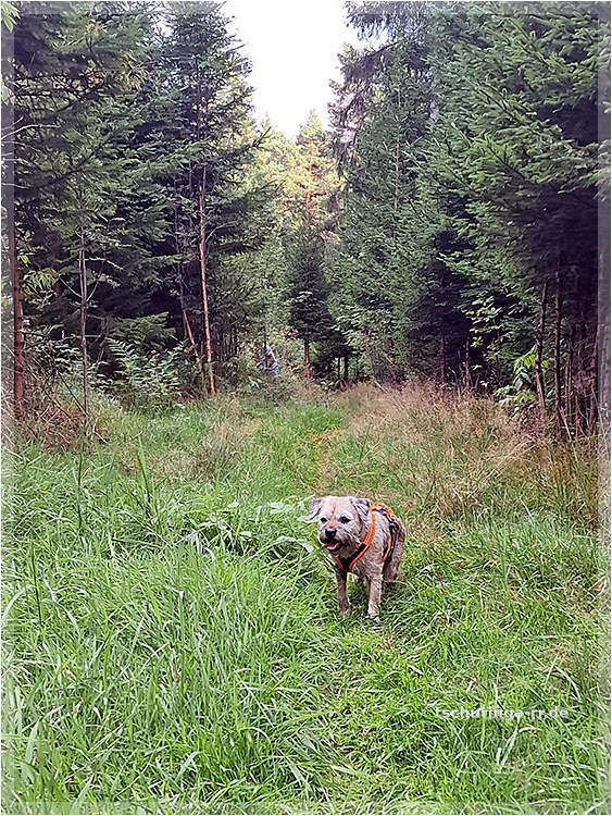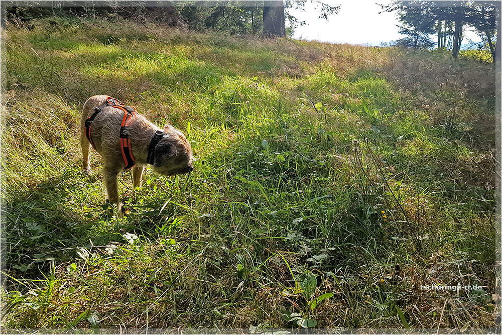 Unser Wanderziel erreichen wir heute nicht. Friedbert hat eine Strecke rausgesucht, die auf Pfaden oben auf dem Berg verlaufen soll. Der Haken ist, dass wir erst gar nicht dorthin kommen, weil auf der Strecke Bauarbeiten sind und diese gesperrt ist. Wir fahren an eine andere Stelle, wo die Wege aber fast ausschließlich geschottert sind. So kommen wir nur auf etwa zwei Kilometer. Manchmal ist es frustrierend, wenn man wandern will und einen Hund dabei hat, der laufen kann und will, aber eben nicht auf Teer oder Schotter. Wieviele Wege geschottert sind, ist uns früher nie aufgefallen. Jetzt haben wir das Gefühl, dass es fast nur solche Wege gibt und das, obwohl die oft als "naturbelassen" bezeichnet werden. Naja, wir machen das Beste draus und dann wird eben mal weniger gelaufen. Hauptsache unser Bub ist dabei.  |