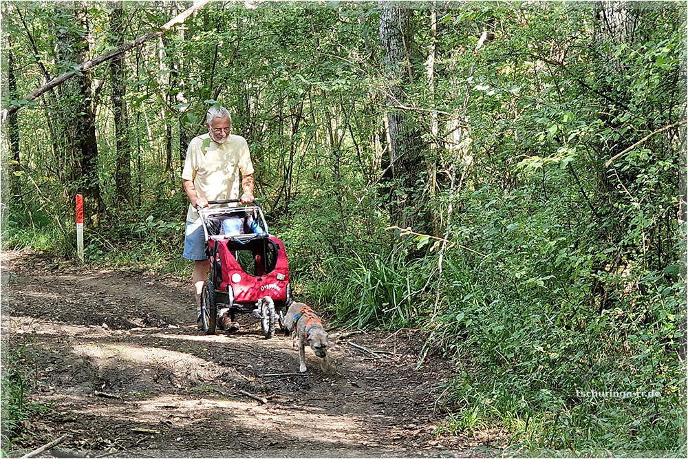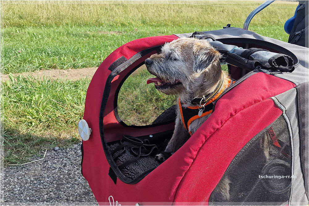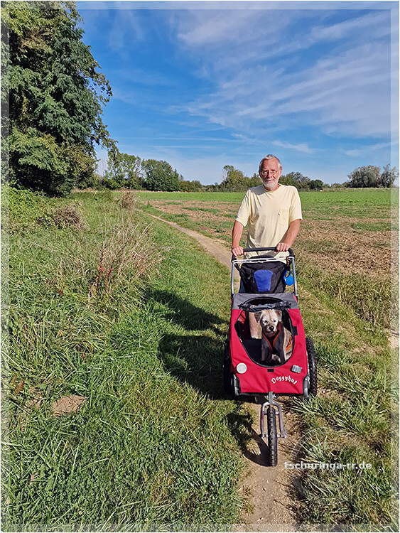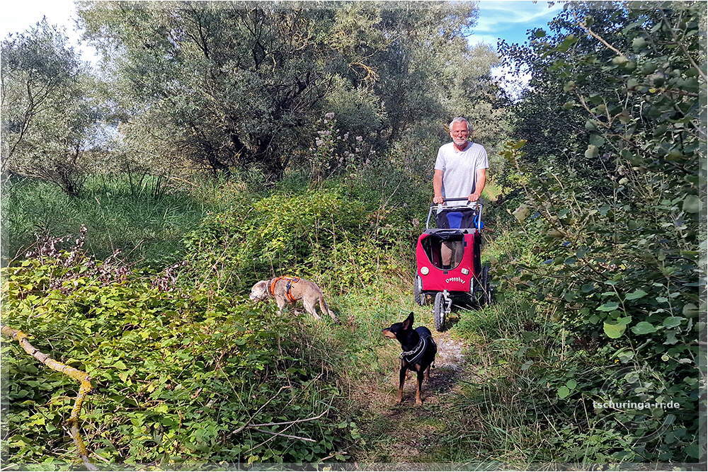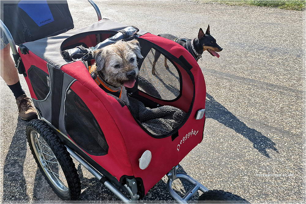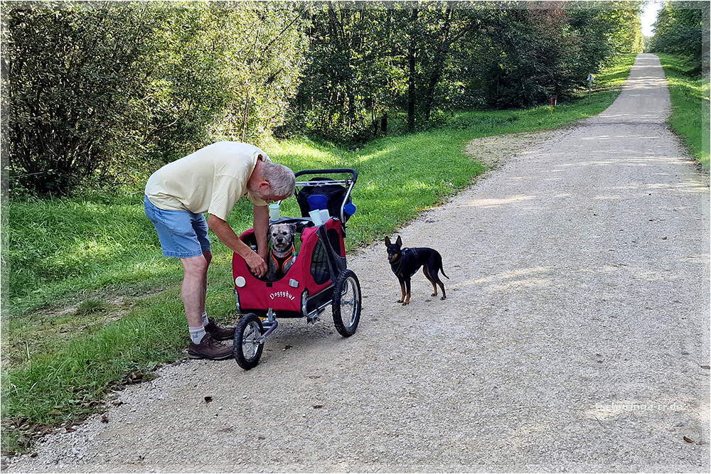 Auf dem Plan steht eine Wanderung um den Lac d'Amance. Es soll gut warm werden und wir starten früh. Im Gepäck Brote, Getränke und Wasser für die Hunde. Für Yukon hat Friedbert den Anhänger aufgebaut, denn 15 km sind für ihn selbst bei topp Untergrund zu viel. Er wird oft geschoben, kann aber auch einiges laufen, zum Teil sogar unangeleint. Das anstrengendste Stück ist die Schlussetappe über die Staumauer. Sonne und kaum ein Lüftchen lassen uns nach Schatten sehnen. Lennox packen wir auf der Mauer auch in den Anhänger, denn in der Hitze merkt man ihm seine inzwischen 11 Jahre doch an.  |