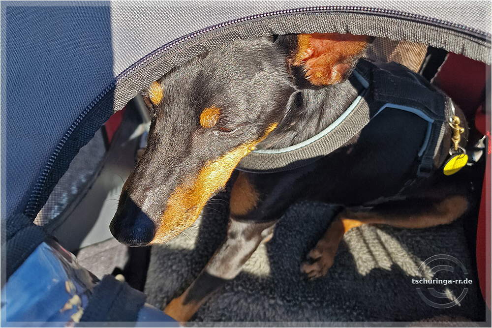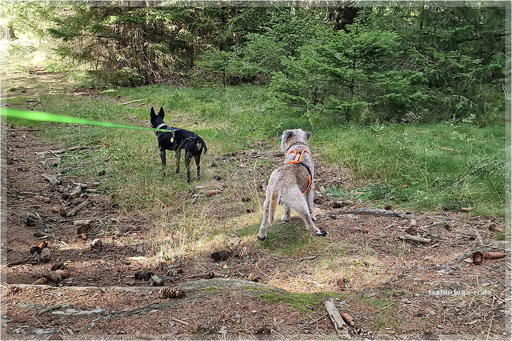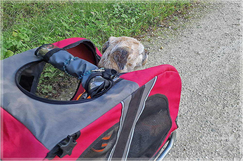 Lennox im Anhänger. Kurz angebunden, weil Yukon es nicht wirklich toll findet, wenn der Nervzwerg ihm so auf die Pelle rückt. Der zeigt dann auch gleich, dass das seine Gründe hat und schnappt direkt nach Yukon. Also die Leine noch etwas kürzer, damit er an Yukon nicht dran kommen kann. Lennox ist halt ein Arschlochköterchen.  |