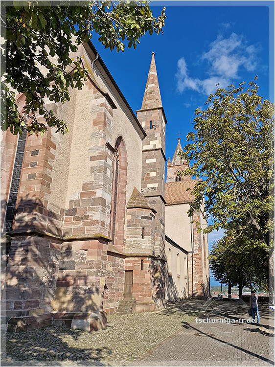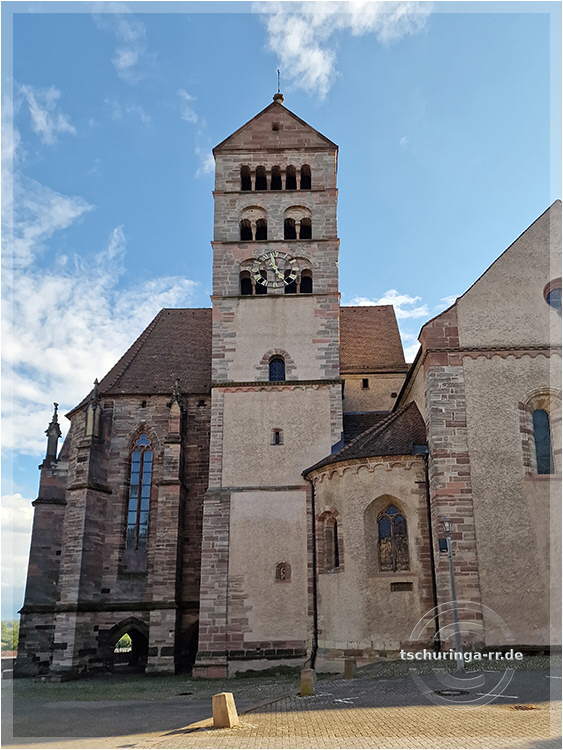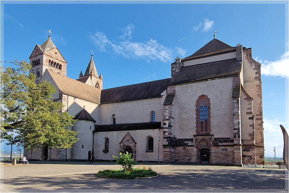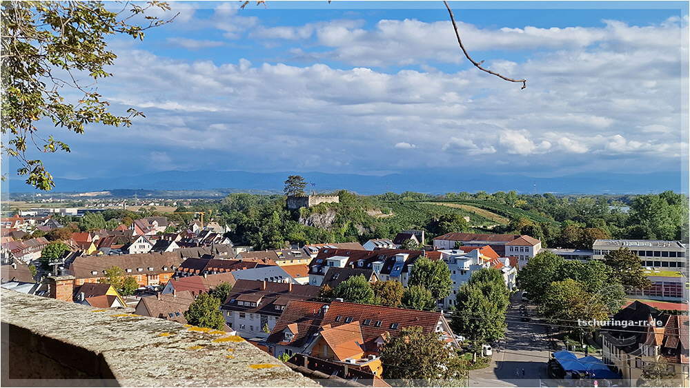 Ich fahre heute Morgen mit dem Bärchen los und hole das neuen Wasserkocher bei der Post in Eisenbach ab. Wie gut, dass man heute alles online in irgendwelche Postfilialen liefern lassen kann. Friedbert hat in der Zwischenzeit Wasser getankt und befüllt noch ein paar Reifen mit Luft. Der Anhänger und der linke Vorderreifen vom Kreos verlieren immer etwas. Der neue Kompressor leistet da gute Arbeit. Erst geht es zum Lidl das Leergut wegbringen und Cappuccino kaufen, der im Angebot ist und dann wird noch Diesel und Gas getankt. Eigentlich wollen wir heute über die Grenze nach Frankreich. Da die Ankunft auf dem anvisierten Stellplatz recht spät ist, entscheiden wir uns für einen Zwischenstopp in Breisach und erst morgen nach Frankreich zu fahren. In erster Reihe ist wie erwartet alles voll. Also stellen wir "Manni" in die dritte Reihe. Friedbert holt die Stühle raus und die Mittagspause machen wir auf der Wiese im Schatten der Bäume. Nachdem Friedbert den Anhänger für Yukon aufgebaut hat, quatschen wir erst mal eine ganze Zeit mit den Nachbarn aus dem Kreis Olpe, die ihren Sunlight wie wir bei der Firma B.S.Reisemobile in Niederndorf gekauft haben. Anschließend geht es erst am Rhein entlang, durch den Fritz-Schanno-Park nach Breisach, wo wir ein leckeres Eis essen, durch die Stadt bummeln und hoch zum Breisacher Münster St. Stephan laufen.  |
