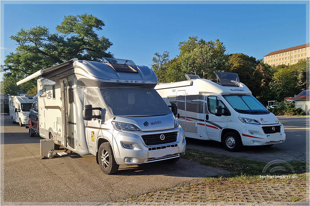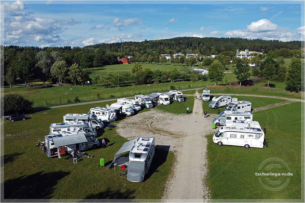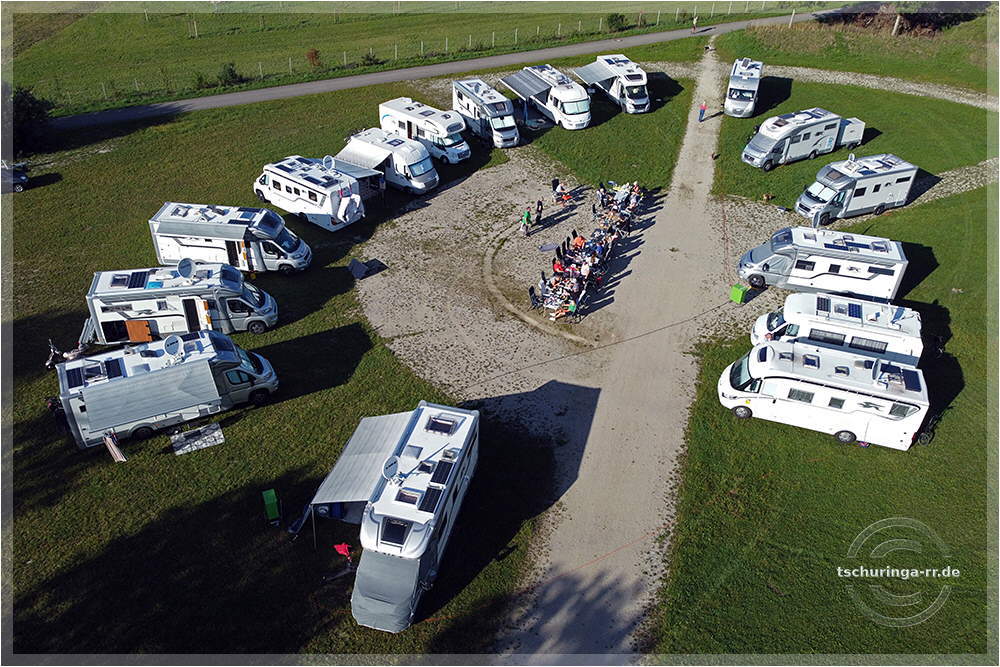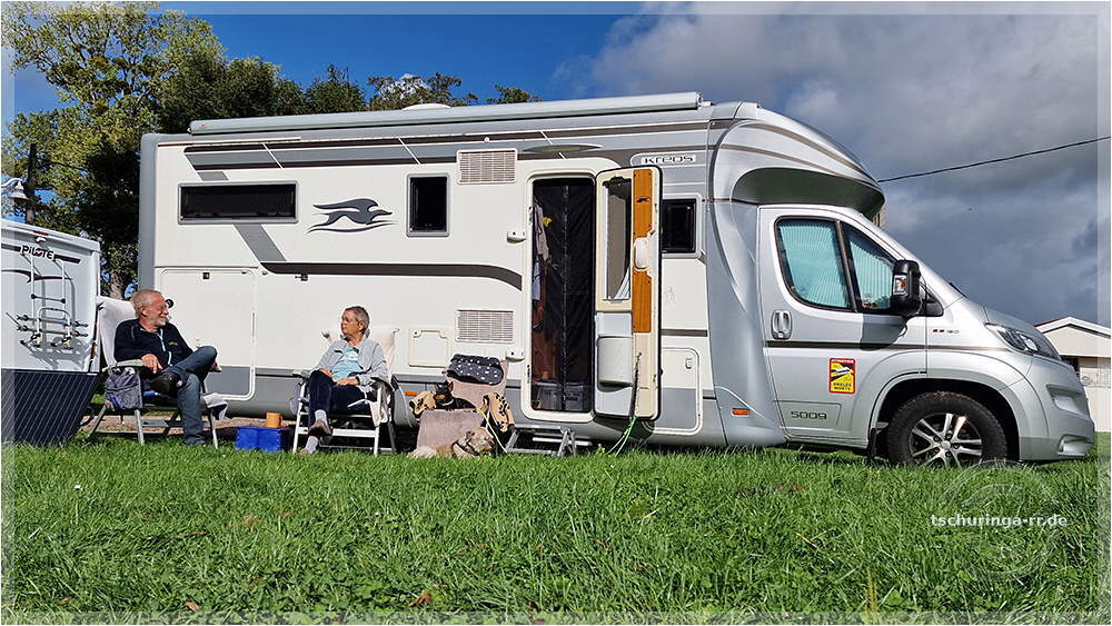 Der Platz füllt sich langsam. Als Höchstzahl für eine Nacht haben wir 17 Laikas hier stehen. Davon sieben Kreos 5009, so wie unser Manni. Ein älterer 5009 ist auch noch dabei, aber das ist das Vorgänger Modell, der 20 cm kürzer ist. Es wir gequatscht, geklönt, gefachsimpelt. Gestern Abend ist ein 5009er aus Grevenbroich dazu gekommen. Die Besatzung und die eines bereits anwesenden Laika Kosmo stellen fest, dass sie nicht mal 10 km voneinander entfernt leben. Die Camperwelt ist halt doch recht klein. Am späten Nachmittag wird eine Tischreihe für das gemeinsame Grillen aufgebaut. Jeder bringt seine eigenen Sachen mit und so sitzen wir in einer langen Reihe mitten auf dem Platz.  |