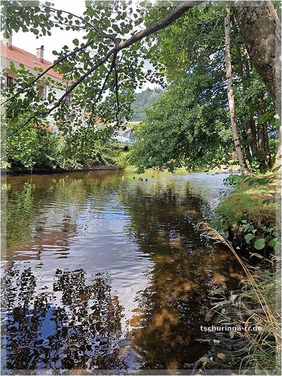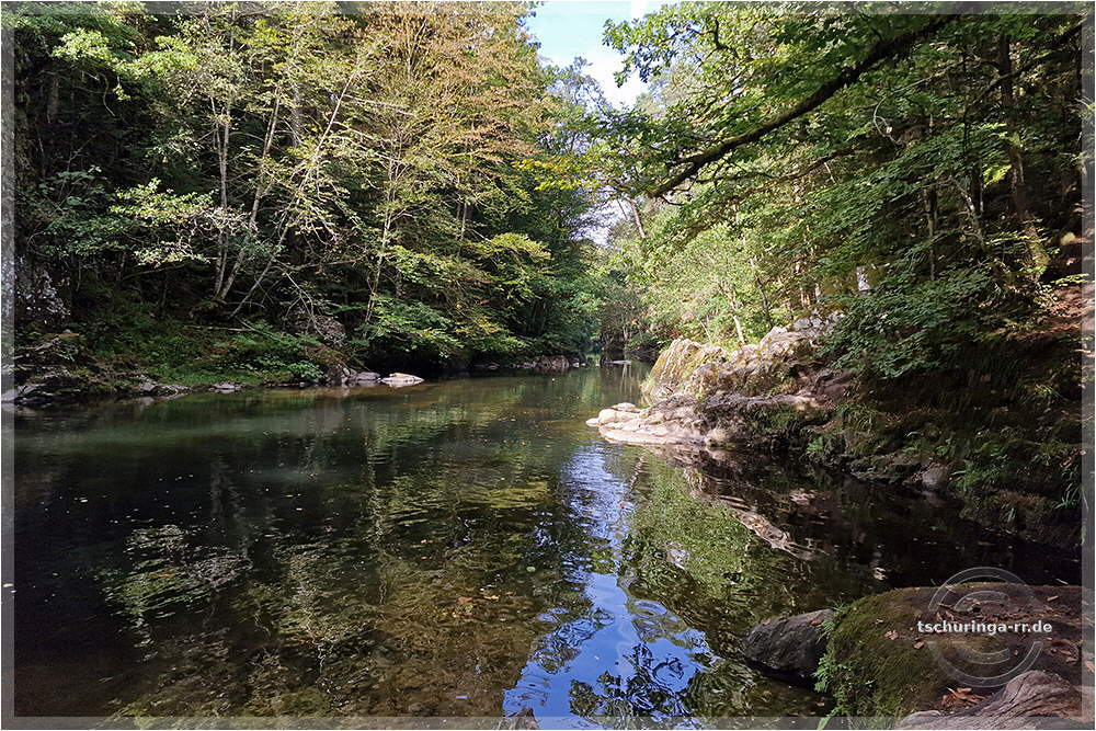 Wir sind in Frankreich. Über Col de la Schlucht, wo es brechend voll ist, fahren wir bis Cornimont auf den dortigen Stellplatz an dem Fluss Moselotte, die später in die Mosel mündet. Auf dem Weg hierher haben wir noch eingekauft, denn Friedbert musste sich mit französischem Käse eindecken. Der Kühlschrank platzt jetzt aus allen Nähten. Da wir bei der Gelegenheit noch ein großes Eis mitgenommen haben, dass wir natürlich mangels Platz im Gefrierfach sofort essen mussten, fällt das Mittagessen heute aus. Während der größten Hitze sitzen wir im Schatten der Bäume. Die nahe Umgebung erkunden wir später und laufen entlang der Moselotte in den Ort, bis wir an eine Straße kommen, wo es zumindest für Yukon nicht weiter geht. Hier drehen wir um und es geht gemütlich zurück zum Womo.  |