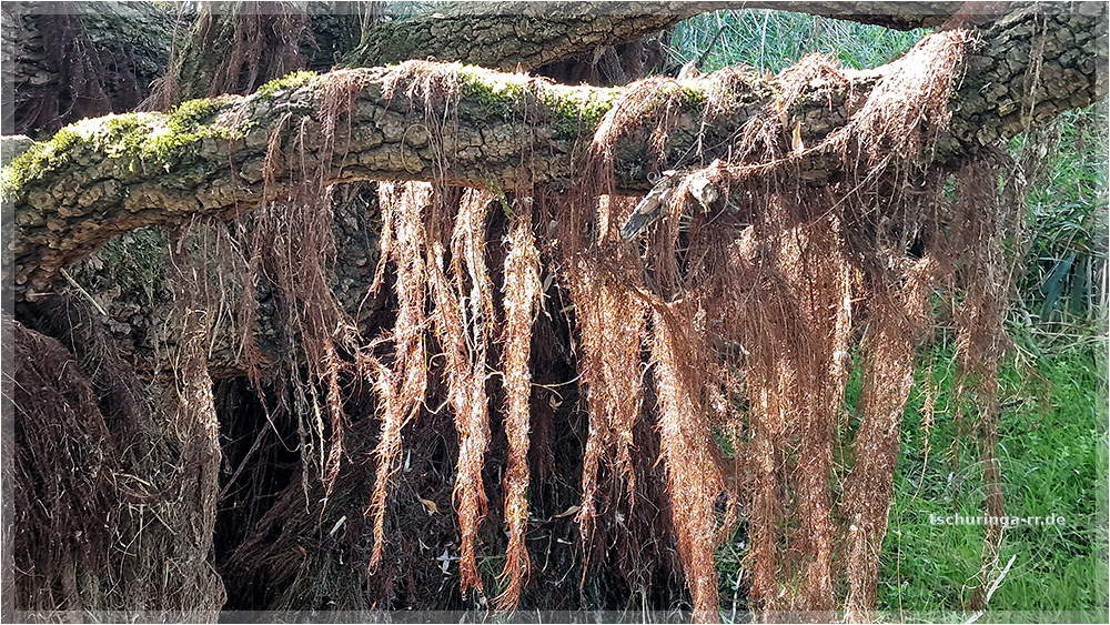 | Die Wurzeln, die von den Weiden unter Wasser ausgebildet wurden, sind jetzt trocken. | ||