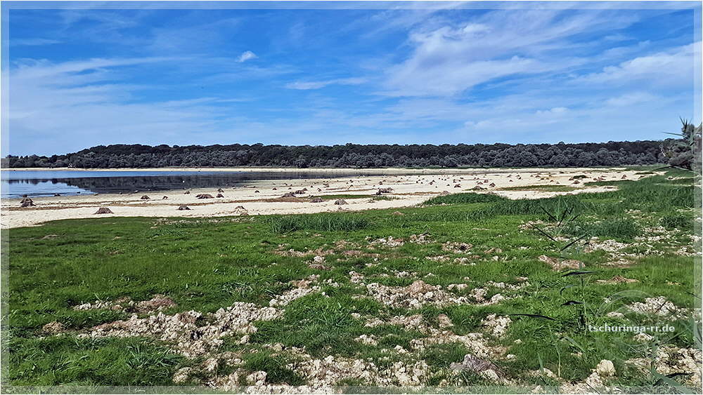 Unser heutiges Ziel ist der Lac d'Orient, ein ebenfalls angestauter See im Regionalen Naturpark Forêt d'Orient, der als Wasserreservoir genutzt wird. Hier waren wir vor 12 Jahren schon mal mit dem erst einjährigen Yukon und unserer Ridgeback-Hündin Kimba, die damals schon 13 Jahre alt war. Jetzt ist Yukon schon 13 Jahre alt. Wo ist nur die Zeit geblieben? Acht Kilometer laufen wir auf die Landzunge, die in den See hinein reicht. Eine schöne Tour. Es ist allerdings wieder sehr warm. Hier sind es um 18:00 Uhr immer noch 24°.  |