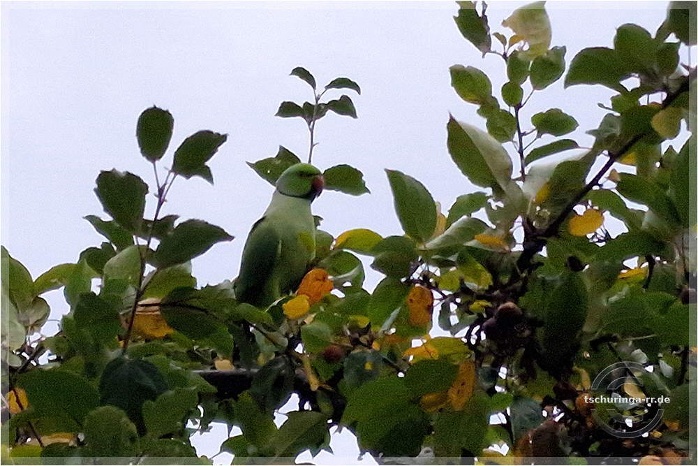 Kein wirklich tolles Foto. Es ist zu dunkel und zu weit oben für das Handy. Aber ich hab wenigstens mal einen erwischt. Einen der vielen Halsbandsittiche, die hier mehr zu hören als zu sehen sind.  |