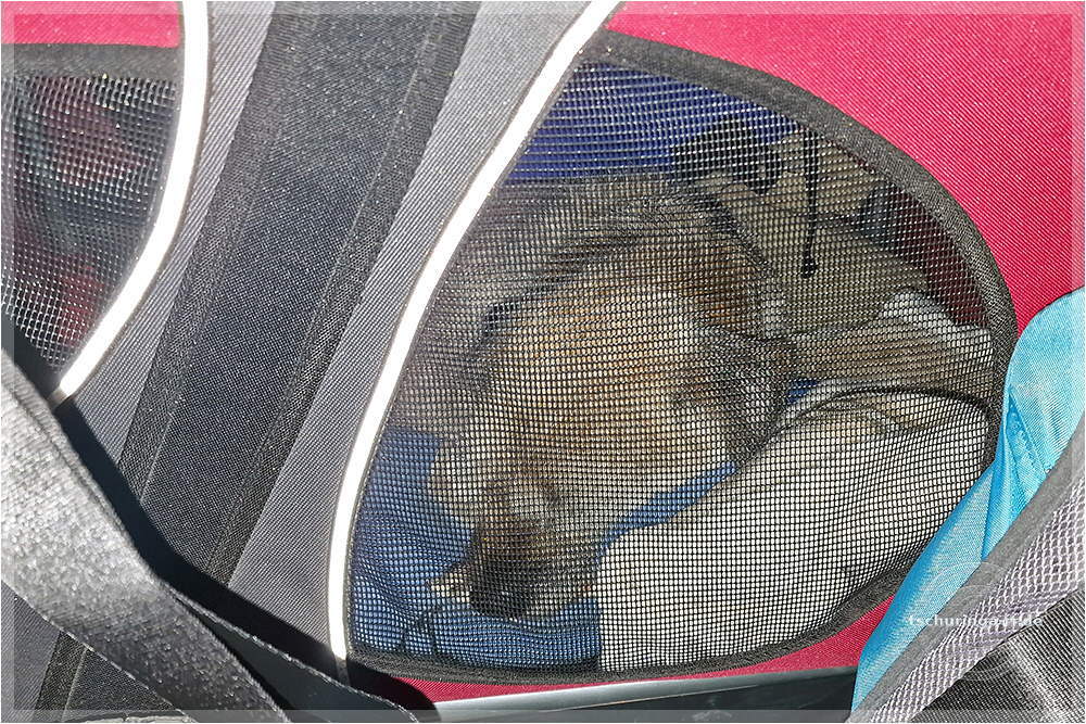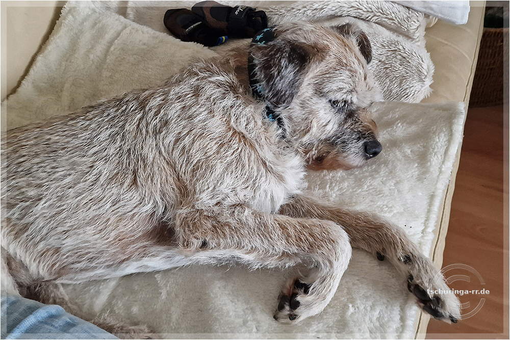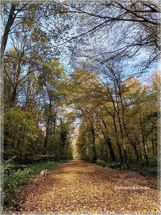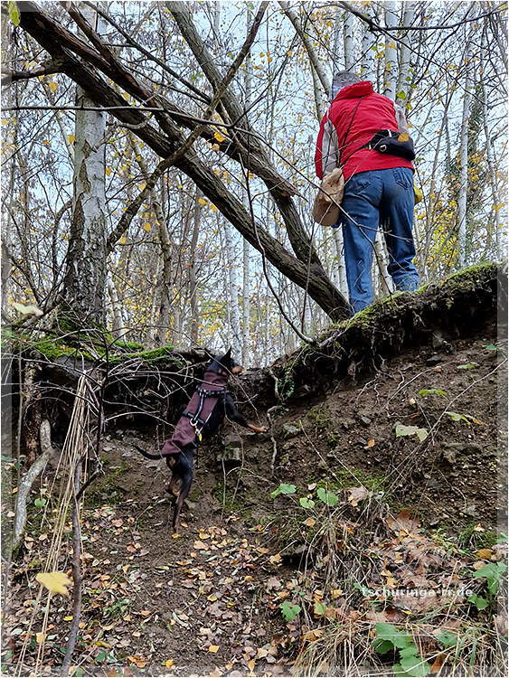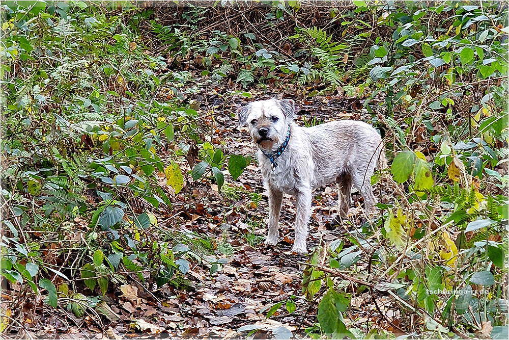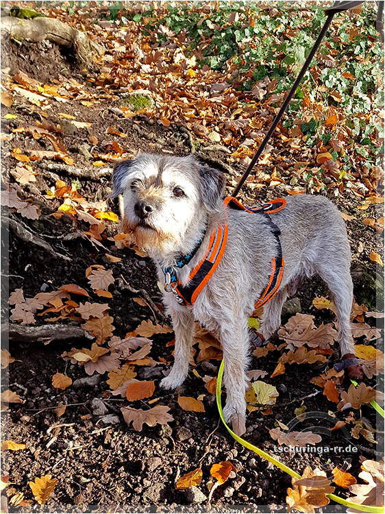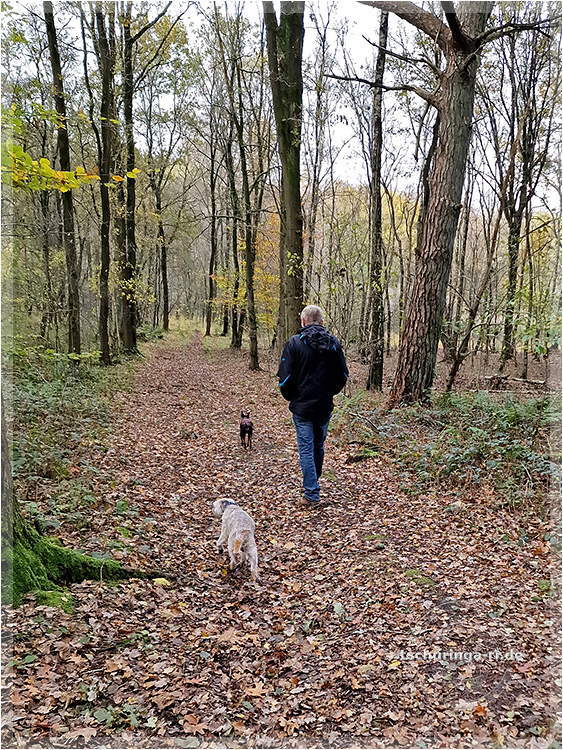 Der Regen ist für nachmittags angesagt. Deshalb fahren wir nach dem Frühstück zum Staatsforst Rheurdt/Littard und laufen überwiegend über matschige Reitwege, weil die ausgesprochen pfotenschonend sind. Allerdings ist der Matsch für Yukon auch ziemlich anstrengend. Die Strecke wird dann auch noch ungewollt länger als geplant, weil Friedbert Yukons Leine verloren hat und wir wieder zurück müssen. Nachdem wir die Leine gefunden haben, geht es dann auf direktem Weg zurück zum Auto. Friedbert trägt Yukon einen Teil der Strecke, weil der Bub doch etwas schwächelt.  |