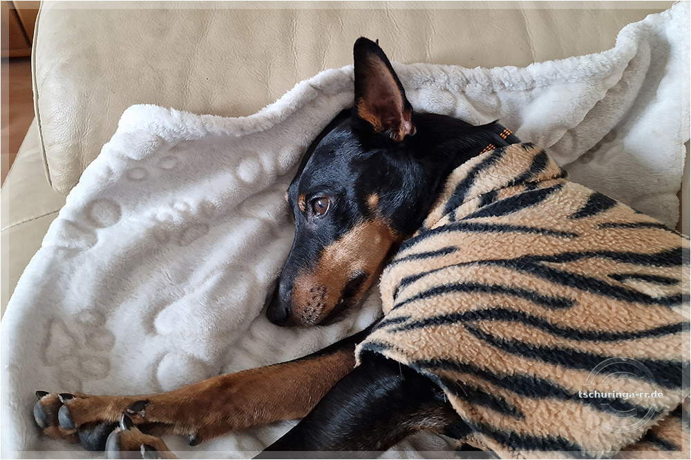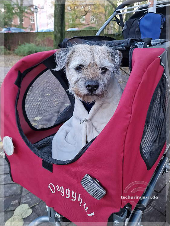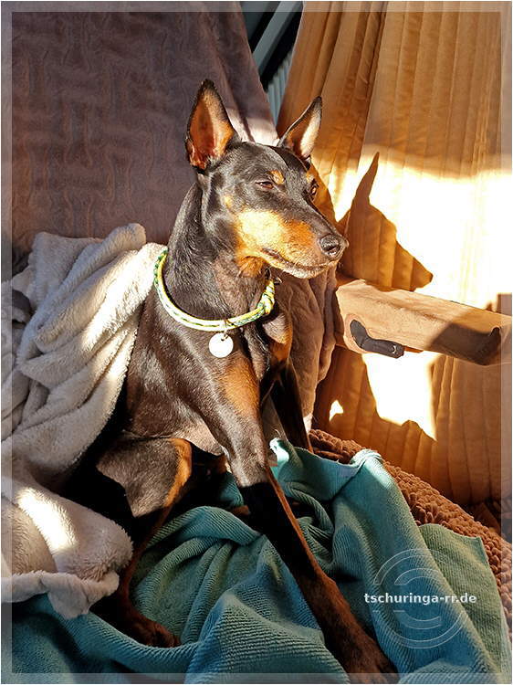 Eilig haben wir es heute nicht, denn auch der nächste Stellplatz ist gebucht. Nach dem Morgengassi mit Lennox holt Friedbert Auto und Trailer vom Parkplatz und reiht Manni vor ihnen ein, während ich Yukon lüfte. Der Panda wird verladen und verzurrt und schon geht es nach Hattingen auf den Stellplatz, den wir bereits zum sechsten Mal besuchen. Kurz vor der Ankunft nutzen wir die nahegelegene Gastankstelle um die Flasche wieder zu füllen. Auto wieder runter vom Anhänger und beide auf dem Parkplatz vor dem Stellplatz unterbringen, dauert etwa 20 Minuten. Dann holt Friedbert Brötchen für mittags. Orkantief Emir sorgt für ordentlich Wind, aber die Sonne lässt sich auch sehen. Wir laufen entlang der Ruhr, wenn auch nicht sehr weit, denn Yukon hat heute ziemlich Probleme. Es wird wieder Zeit für seine nächste Librela Injektion. Die letzte liegt jetzt viereinhalb Wochen zurück und man merkt jetzt doch, dass die Wirkung nachlässt. Die Spritze bekommt er dann auch direkt nachdem wir am Womo angekommen sind.  |