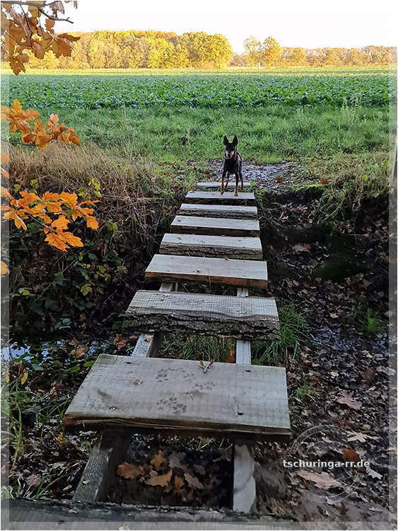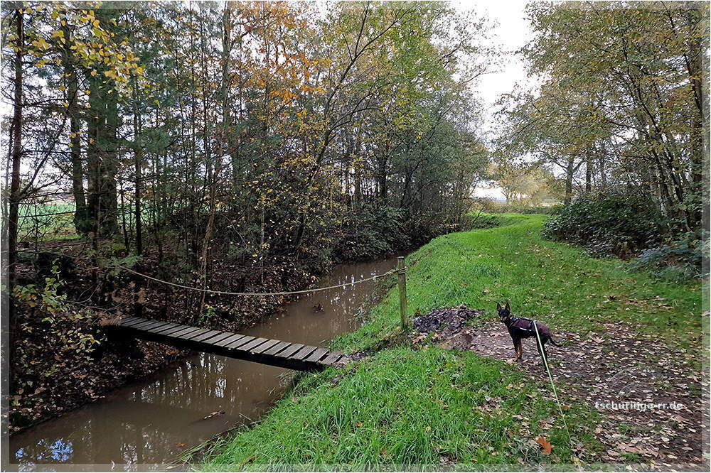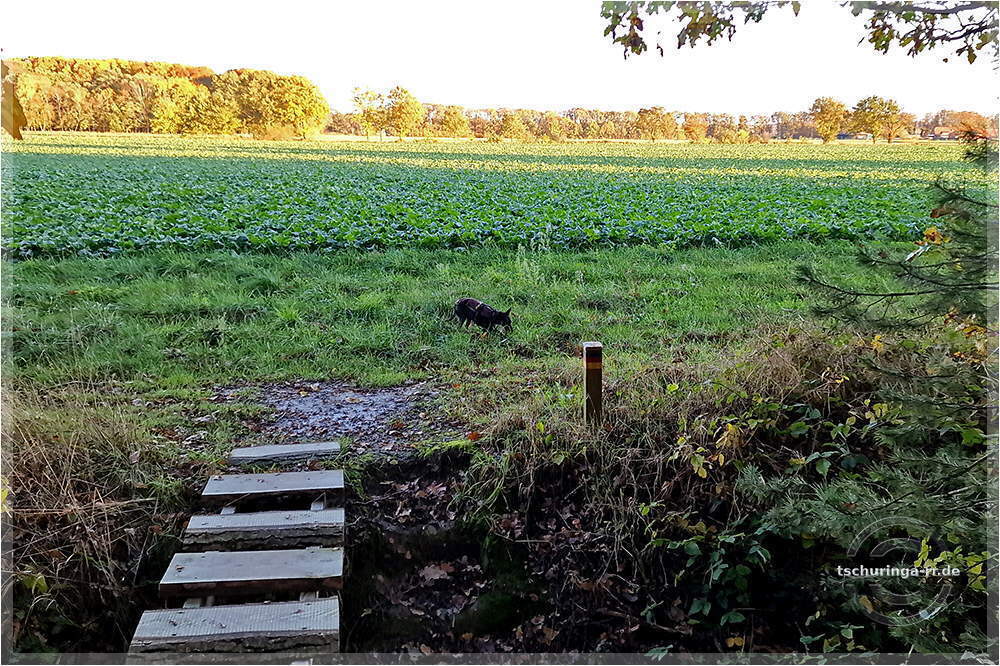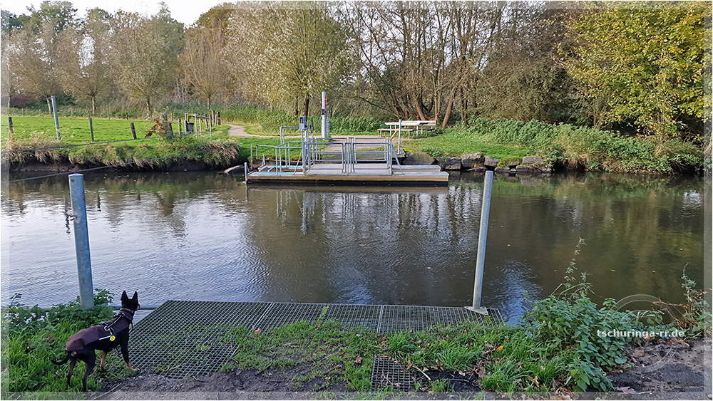 Heute Nachmittag ist Regen angesagt. Deshalb starten wir schon zeitig zu unserer heutigen kleinen Wanderung. Unser Ziel ist die Selbstbedienungsfähre AIWA (im Amtsdeutsch "Anlage im WAsser > AiWA). Dort sind wir 2017 schon mal gewesen. Wir laufen über eine Wiese, damit Yukon auch mal frei laufen kann, denn alle Wege sind geschottert. Um wieder den Weg zu erreichen, müssen wir die Hunde unter und uns durch den Stacheldraht lotsen. Klappt aber alles gut. Wir setzen mit der Fähre über, erreichen den Zusammenfluss von Nette und Niers und folgen der Niers noch ein Stück, bis es für Yukon nicht mehr weitergeht. Da drehen wir um und es geht zurück zum Auto. Nachmittags kommt dann auch der "versprochene" Regen.  |