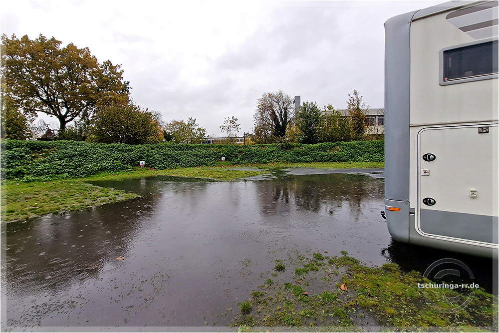 So kommen wir denn halbwegs trocken los. Ich fahre Panda und Trailer zum 18 Kilometer weit entfernten Stellplatz von Aldekerk. Friedbert biegt an der Gastankstelle ab und füllt noch mal auf. Wir fahren noch einkaufen, nachdem wir "Manni" und den Trailer zwischen den riesigen Pfützen untergebracht haben. Bei dem Mistwetter kann man sowieso nichts Gescheites unternehmen. Mittags lassen wir uns den Apfelkuchen schmecken. Der Stellplatz steht weitgehend unter Wasser. Ich bin echt froh, dass ich beim Aldi noch ein Paar Gummistiefel mitgenommen habe. Die kommen heute tatsächlich in den Einsatz, denn mit Schlappen kommt man nicht trockenen Fußes bis zur Heckgarage.  Später lockert es auf und der überflutete Platz zeigt uns eine richtig schöne Seite.    |