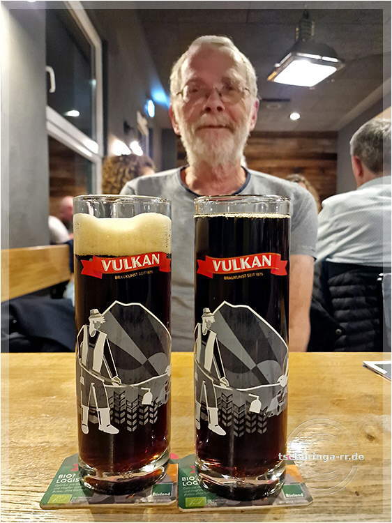Heute geht mal wieder ein Wecker. Nach dem Frühstück füllt Friedbert das Frischwasser auf, während ich Lennox lüfte. Danach fährt er noch zur Gastankstelle. In der Zeit kommt auch Yukon zu seinem Gassigang. Den Anhänger noch angekoppeln und schon geht's los in die Eifel. Bereits um kurz nach 12:00 sind wir in Mendig auf dem Stellplatz. Panda wieder runter, noch zwei Mal das Womo umstellen, bis auch die SAT Anlage an den Bäumen vorbei den Satelliten findet, und wir sind fertig mit unserem Umzug. Nach Kaffee, Cappuccino und Kuchen packen wir die Hunde ins Auto, fahren in die Nähe des Lacher Sees und wandern eine gute Stunde bei endlich mal wieder Sonnenschein. Das Abendessen gibt es heute im Vulkanbrauhaus. Der Besuch im Brauhaus ist bereits obligatorisch, wenn wir in Mendig auf dem Stellplatz sind.  |