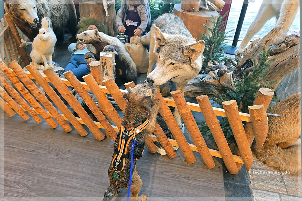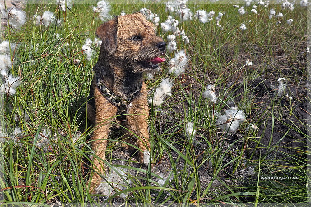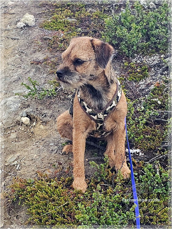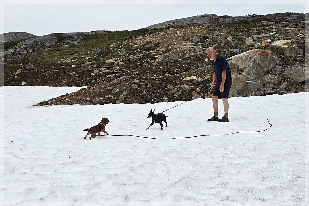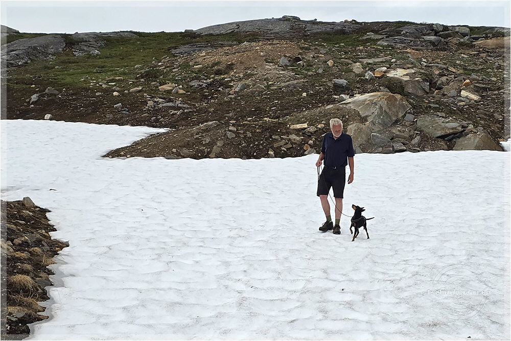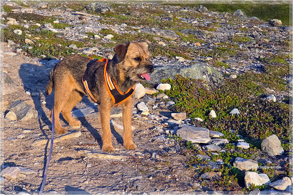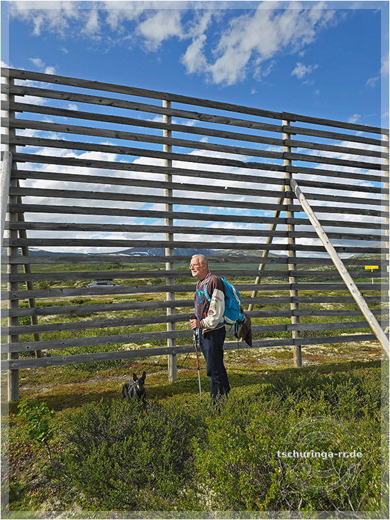 Heute Morgen sind es nur 8° Celsius und der Wind fühlt sich wie 1° an. Am Nachmittag soll es besser sein. Auf dem Hinweg fällt uns ein ziemlich schimpfender Vogel auf. Da muss die Canon ran und ich kann ein Blaukehlchen auf den Chip gebannt. Weiter geht es entlang des Schneefangzauns zur Brücke über die Svone, durch eine Unterführung unter der Bahn her und von da durch ein Gatter in den Bereich der Moschusochsen über den Moskusstien. Wir laufen den Wanderpfad bergan bis wir auf eine Gruppe stoßen, die mit Ferngläsern auf die Hochebene schaut. Angeblich haben sie dort Tiere gesehen. Ich mache mit dem großen Tele zwei Fotos, die am Rechner klar zeigen, dass da ausschließlich Felsen unterwegs waren. Zwischendurch brauchen wir unsere Regenjacken. Der Wind ist echt unangenehm. Una stört das gar nicht, aber Lennox ist froh über seine Jacke. |