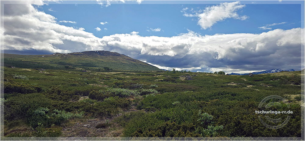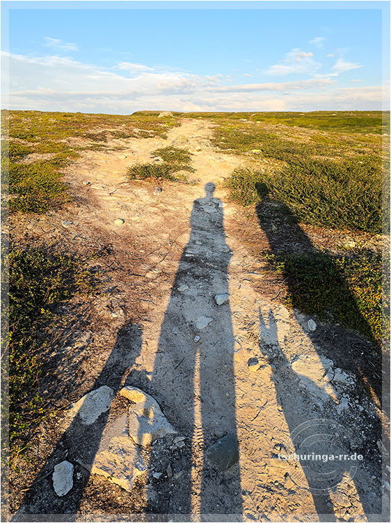 Heute geht es bereits am Vormittag los, denn das Wetter soll (angeblich) nachmittags unbeständiger sein. Wir sind wieder auf dem Kongevegen unterwegs, diesmal aber in die andere Richtung. Allzu weit kommen wir allerdings nicht. Zuerst treffen wir auf einen Goldregenpfeifer, der uns von seinem Nest ablenken will. Da muss ich natürlich fotografieren. Danach kommt der Regen immer näher und wir drehen um, denn auf "klatschnass" haben wir keine Lust. Es bleibt aber trocken und wir sehen den Guss nur aus der Ferne. Das Wetter ist besser als vorhergesagt, dehalb laufen wir am Nachmittag ein Stück des Weges von Vorgestern. Über den Gåvålivegen, am Ufer des Gåvålivann. Auf dem Rückweg biegen wir am Schneefanggitter ab, weil wir schauen wollen, wo die Brücke über die Svone führt. Denn die wollen wir morgen überqueren, um auf der anderen Seite zu wandern. Vorausgesetzt, dass Wetter hält sich an die Vorhersagen. |