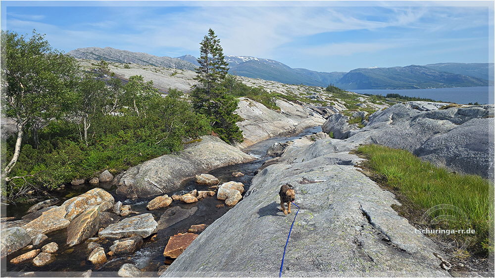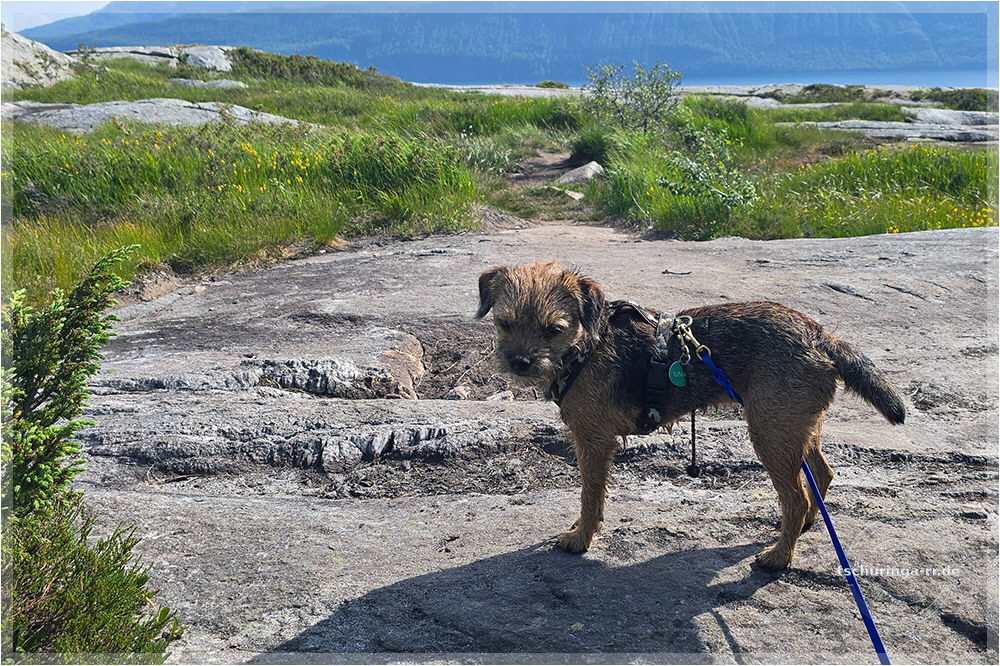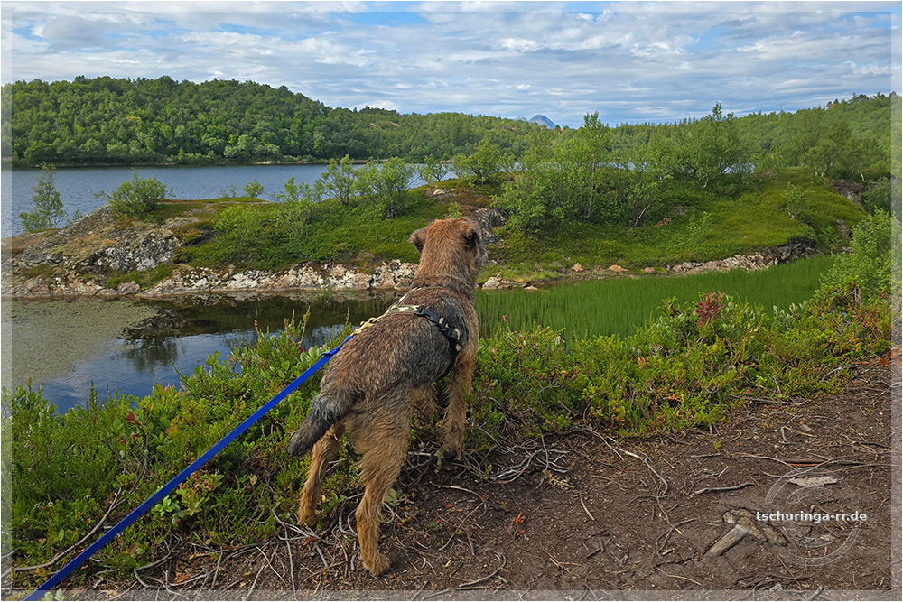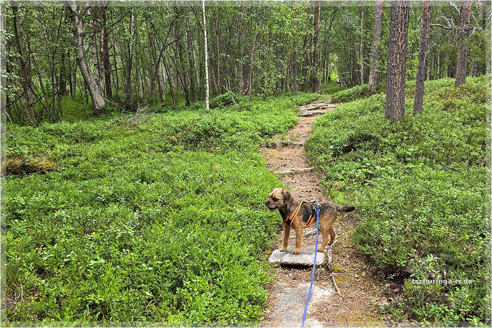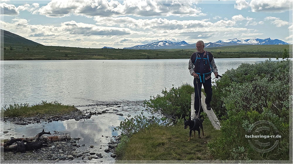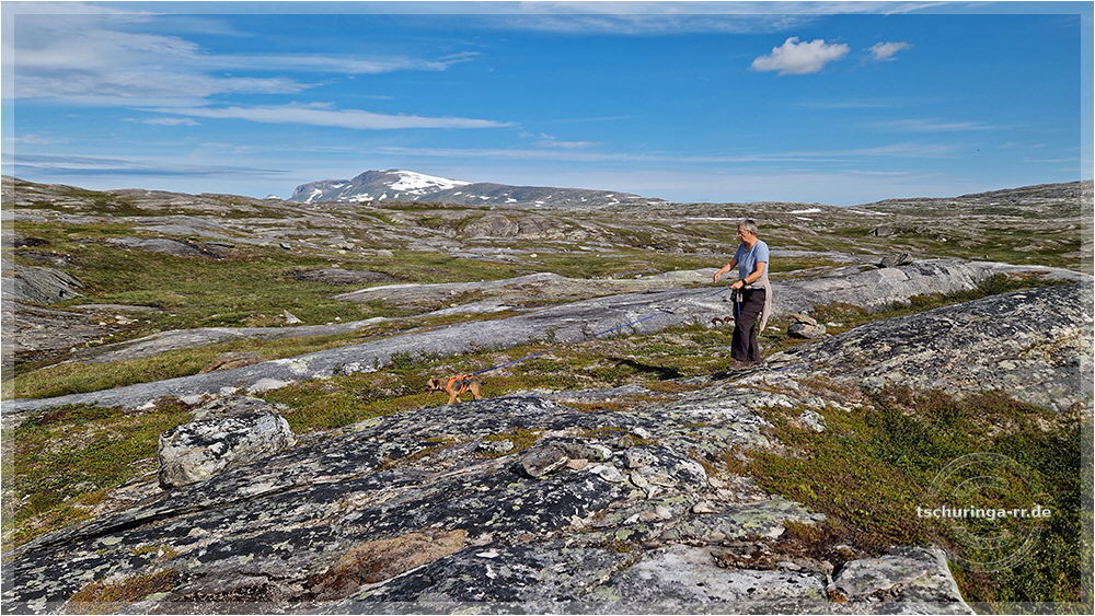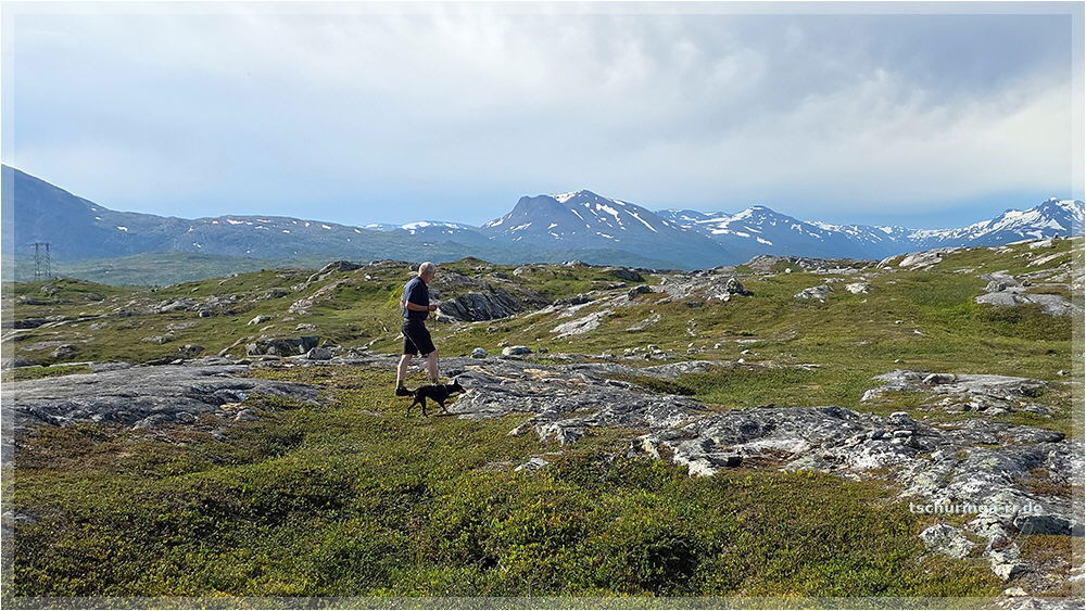 Nach einer größeren Waschaktion, weil Una ihre Box vollgek*tzt hat, laufe ich mit beiden Hunden eine kleine Gassirunde. Danach wollen wir eigentlich auf der anderen Seite der E6 wandern. Weit kommen wir allerdings nicht, denn kurz hinter dem Fluss Gubbeltædno steht ein Verbotsschild. Also heißt es: Umdrehen. Wir fahren weiter und lassen uns auf einem kleinen Parkplatz bei Storjord nieder. Nach dem Mittagessen starten wir zu einer Wanderung. Zuerst erkunden wir den Trampelpfad hinter dem Womo, der aber nach gut 100 Metern endet. Als wir zurück kommen ist "Manni" nicht mehr allein. Nach kurzem Gespräch mit den neuen Nachbarn wandern wir zum See Tjernfjelltjønna, den wir auf teilweise nicht vorhandem Pfad umrunden. Zum Teil geht es über Felsbrocken. Da läuft wohl sonst auch niemand her, denn die Angler nutzen eher die ausgetretenen Trampelpfade. |