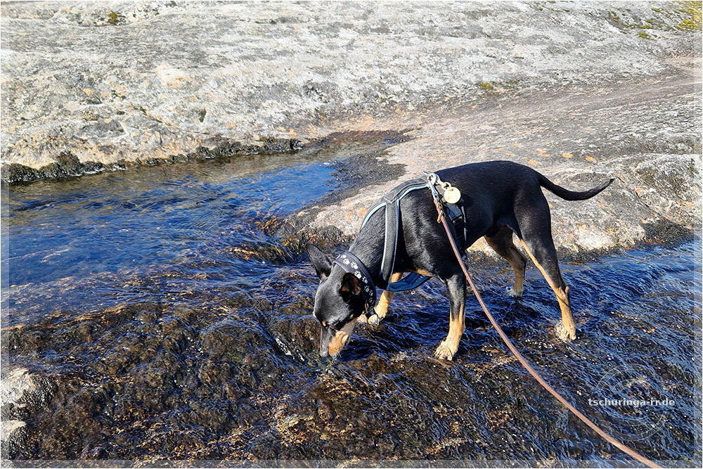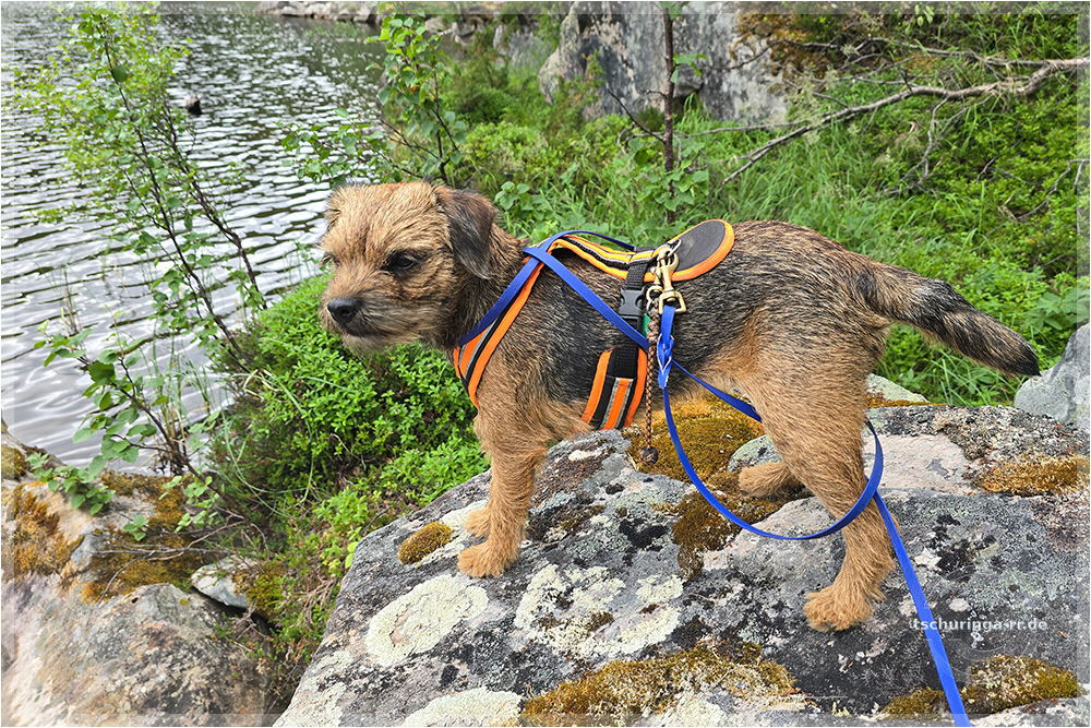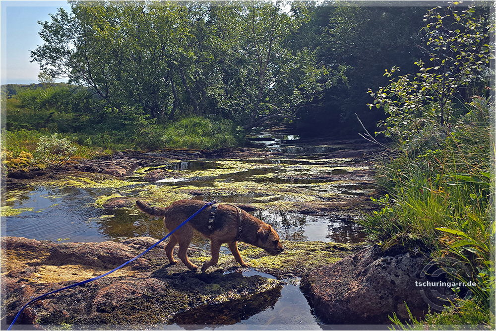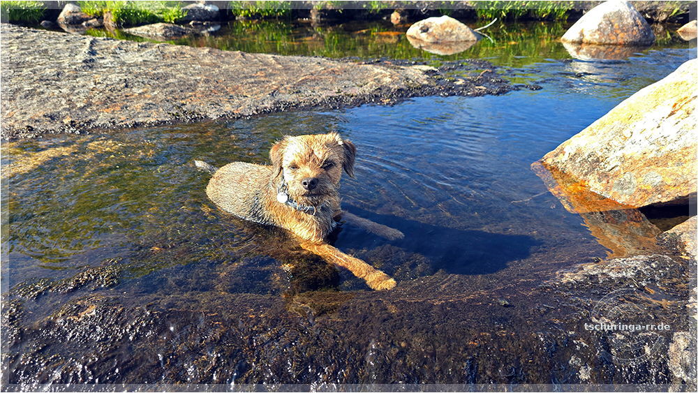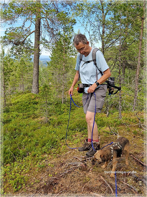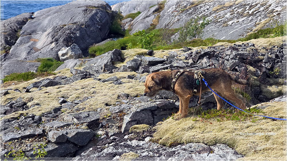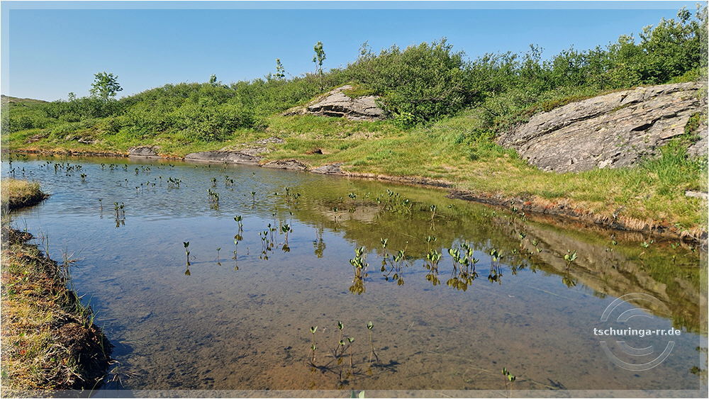 Nach einer größeren Waschaktion, weil Una ihre Box vollgek*tzt hat, laufe ich mit beiden Hunden eine kleine Gassirunde. Danach wollen wir eigentlich auf der anderen Seite der E6 wandern. Weit kommen wir allerdings nicht, denn kurz hinter dem Fluss Gubbeltædno steht ein Verbotsschild. Also heißt es: Umdrehen. Wir fahren weiter und lassen uns auf einem kleinen Parkplatz bei Storjord nieder. Nach dem Mittagessen starten wir zu einer Wanderung. Zuerst erkunden wir den Trampelpfad hinter dem Womo, der aber nach gut 100 Metern endet. Als wir zurück kommen ist "Manni" nicht mehr allein. Nach kurzem Gespräch mit den neuen Nachbarn wandern wir zum See Tjernfjelltjønna, den wir auf teilweise nicht vorhandem Pfad umrunden. Zum Teil geht es über Felsbrocken. Da läuft wohl sonst auch niemand her, denn die Angler nutzen eher die ausgetretenen Trampelpfade. |