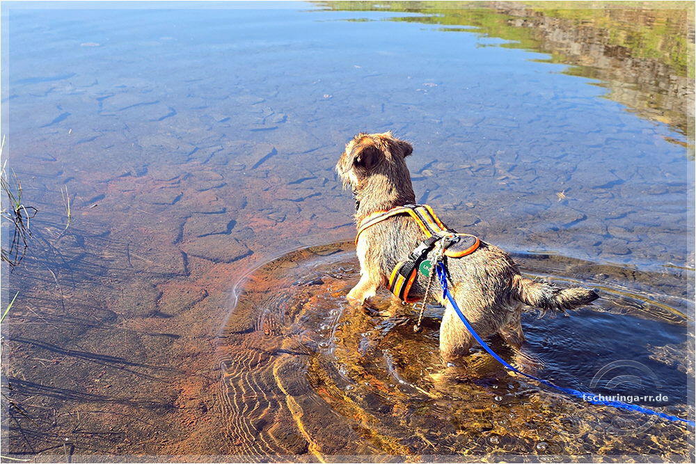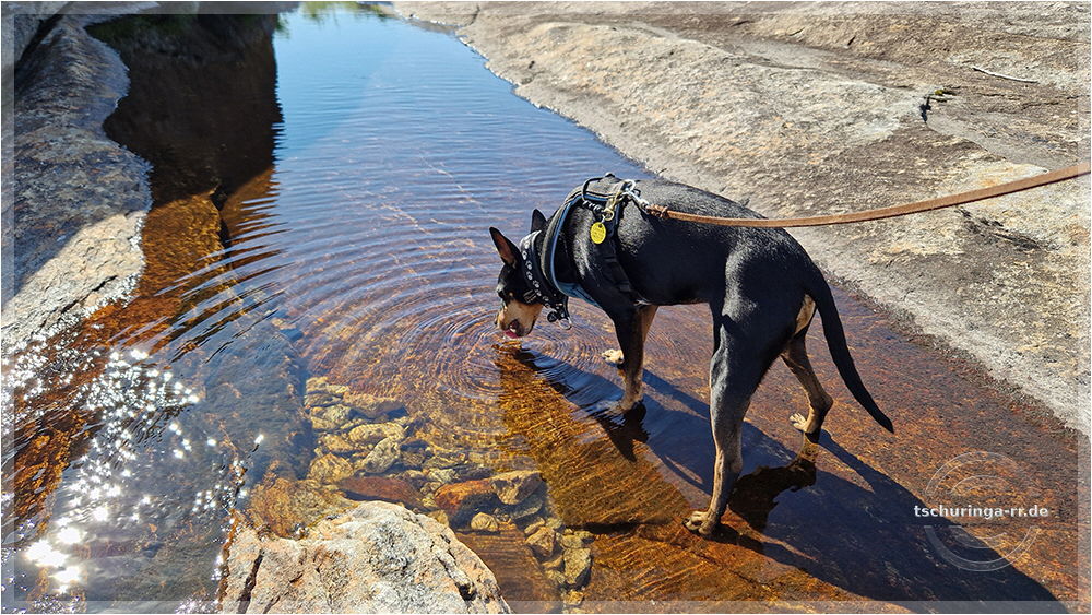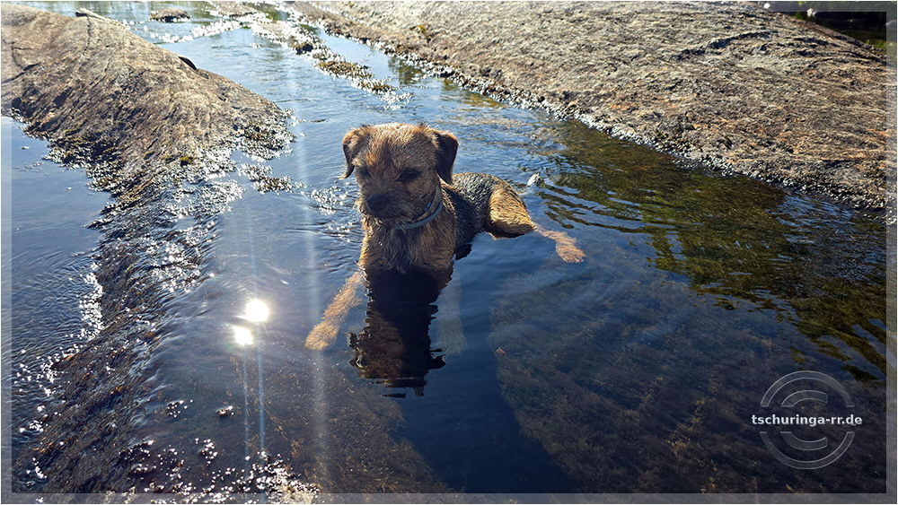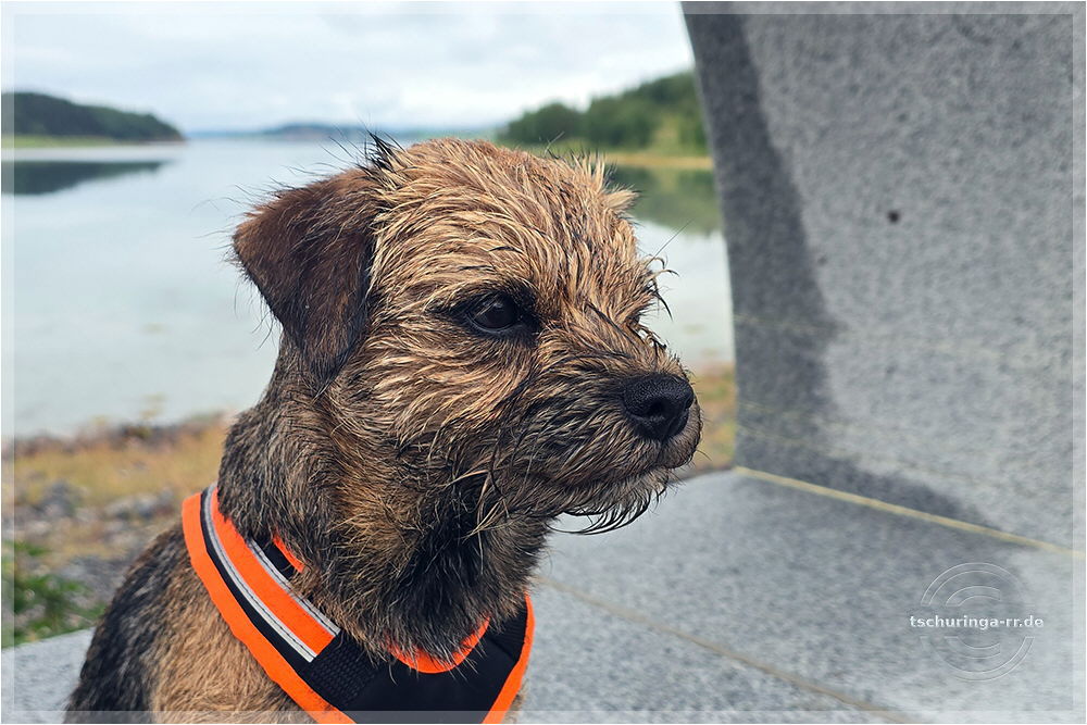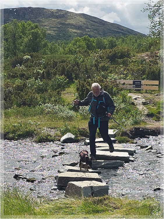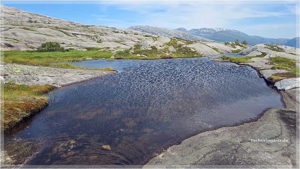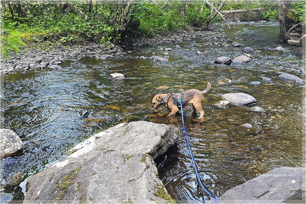Nach einer größeren Waschaktion, weil Una ihre Box vollgek*tzt hat, laufe ich mit beiden Hunden eine kleine Gassirunde. Danach wollen wir eigentlich auf der anderen Seite der E6 wandern. Weit kommen wir allerdings nicht, denn kurz hinter dem Fluss Gubbeltædno steht ein Verbotsschild. Also heißt es: Umdrehen. Wir fahren weiter und lassen uns auf einem kleinen Parkplatz bei Storjord nieder. Nach dem Mittagessen starten wir zu einer Wanderung. Zuerst erkunden wir den Trampelpfad hinter dem Womo, der aber nach gut 100 Metern endet. Als wir zurück kommen ist "Manni" nicht mehr allein. Nach kurzem Gespräch mit den neuen Nachbarn wandern wir zum See Tjernfjelltjønna, den wir auf teilweise nicht vorhandem Pfad umrunden. Zum Teil geht es über Felsbrocken. Da läuft wohl sonst auch niemand her, denn die Angler nutzen eher die ausgetretenen Trampelpfade. |