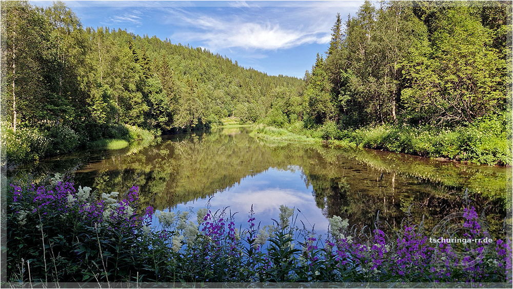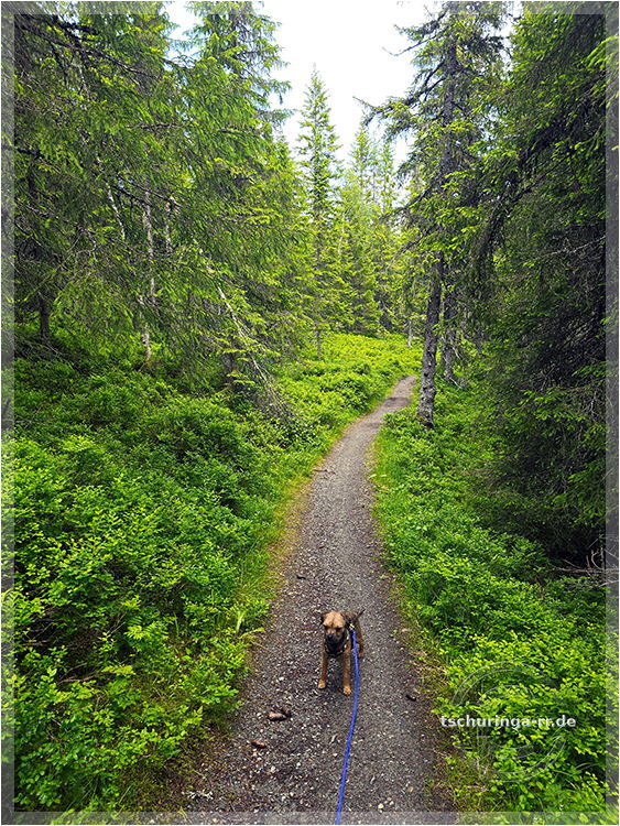 Wir fahren weiter Richtung Trondheim. Aber irgendwie scheint es die hier in der Gegend nicht zu geben. Weiter südlich habe ich schon welche gekauft und auch in zwei weiteren Läden gesehen, aber da die Truhe noch voll war, konnte ich keine mitnehmen. Jetzt ist Platz und nichts zu bekommen. Okay, dann gibt es halt Schwein. Den Hunden ist es sowieso egal, Hauptsache der Bauch wird gefüllt. Friedbert hat einen Parkplatz in der Nähe eines Sees ausgesucht. Als wir dort ankommen entscheiden wir uns dagegen, denn der ist gerammelt voll mit PKWs und Wohnmobilen. Wir fahren lieber noch ein gutes Stück bergauf und kommen auf dem Storsvingen Parkplatz unter, wo nur ein paar PKWs von Wanderern stehen. Am Abend sind wir da ganz allein. Mittags gibt es Kuchen und danach starten wir zu einer schönen Sechs-Kilometer-Wanderung. Unser Wanderweg geht über Loipen. Naja, im Winter sind es Loipen, jetzt teilweise Schotterwege. Wir biegen ab zum See Kobberdammen, den wir umrunden, um dann über die nächste Loipe den Heimweg anzutreten. |