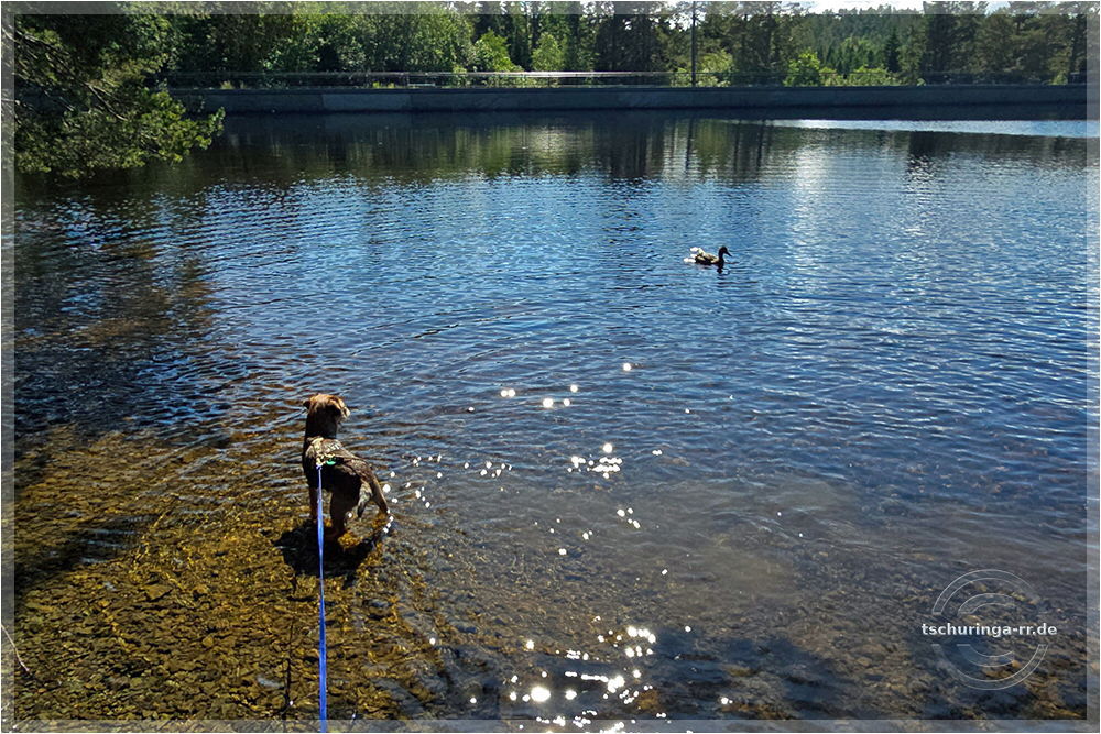 Die Sonne scheint. Wir verlassen unseren Platz, fahren anderthalb Kilometer bergab und lassen uns auf dem Parkplatz am Baklidammen nieder, der am Samstag so voll war. Am Vormittag laufen wir um den Baklidammen. Nachmittags wandern wir zum Theisendammen, den wir ebenfalls umrunden. |