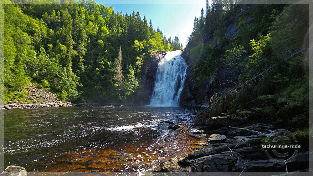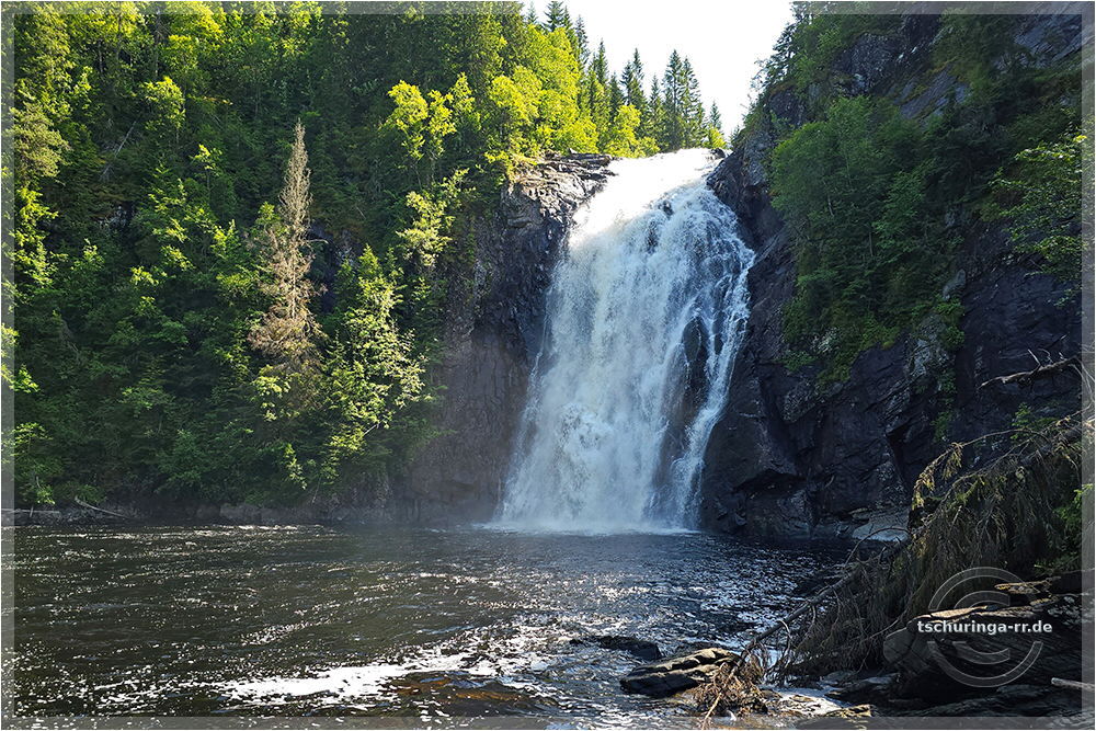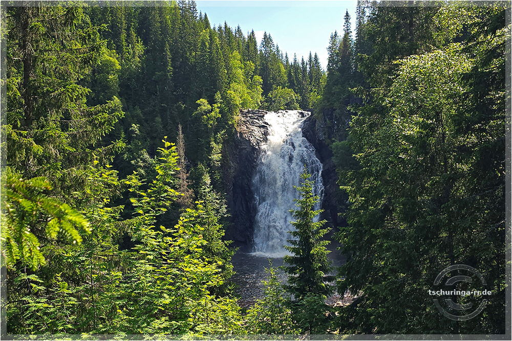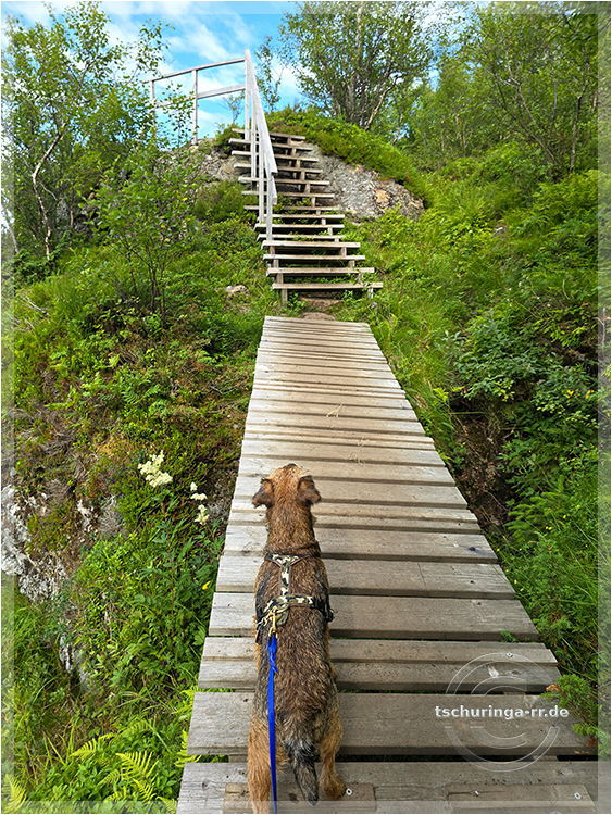 Auch heute scheint die Sonne. In Trondheim kaufen wir ein. Dann geht es weiter zum Parkplatz bei Hommelvik, von wo aus der Weg zum Storfossen losgeht. Nach dem Mittagessen laufen wir zu dem Wasserfall, der eine Fallhöhe von 40 Metern hat und gut besucht ist. Friedbert geht mit Una noch etwas weiter zu einem zweiten kleineren Wasserfall, dem Mettifossen. Zu dem dritten, dem Dølanfossen, steigt er aber auch nicht ab. Ich gehe in der Zeit gemütlich mit Lennox zum Wohnmobil zurück. |