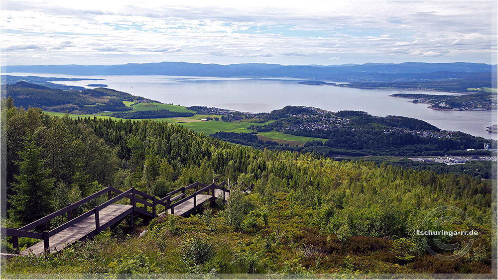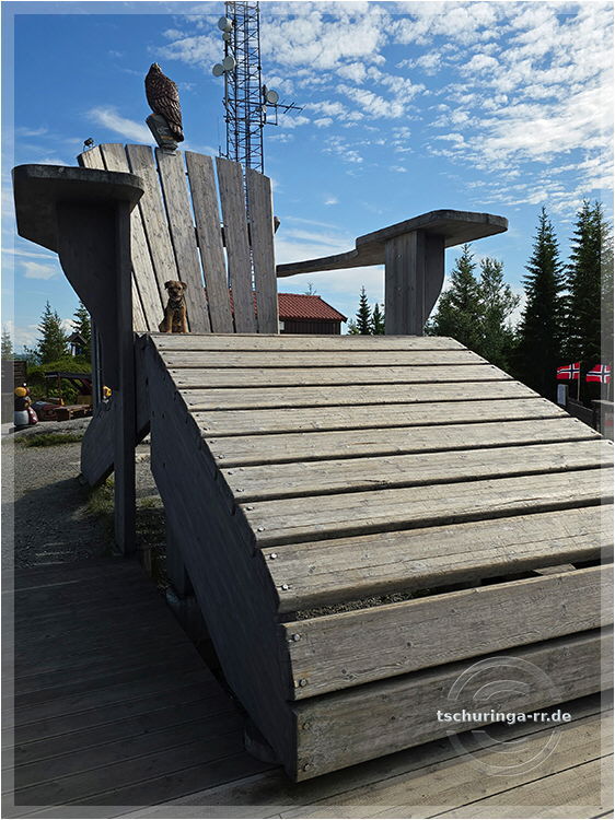 Heute ist mit 22° Celsius der bisher wärmste Tag, seit wir in Norwegen sind. Wir fahren bis Steinkjer, wo wir zum größten Liegestuhl der Welt wandern wollen. Über den Trollstien geht es rauf zum Oftenåsen, wo der Liegestuhl steht. Entlang des Trollstien sind viele Holzfiguren aufgestellt. Insgesamt sollen es über 60 sein. Nicht alle haben wir gesehen, weil wir einen Teil des Weges nicht gegangen sind. Gut sechs Kilometer und 290 Höhenmeter reichen uns aber auch. Es sind so viele Fotos geworden, dass ich dafür eine eigene Seite erstellt habe, weil die hier den Rahmen sprengen würden. |