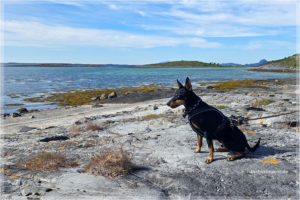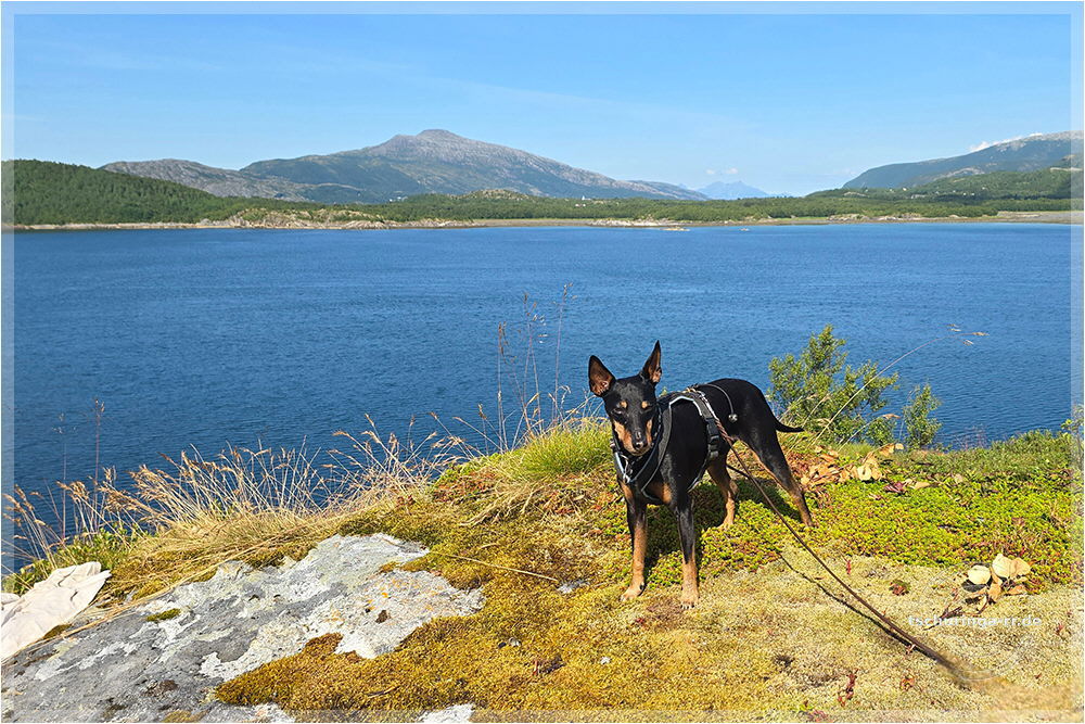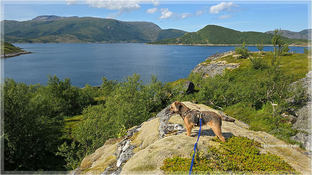 Mit 34° ist heute der wärmste Tag in Norwegen. Wir hoffen, dass es dabei auch bleibt. Eigentlich sind wir auch nach Norwegen gefahren um der Sommerhitze in Deutschland zu entgehen. Das war dann wohl nix. Wir fahren den Melfjordveien runter bis Melfjordbotn, genießen die tollen Aussichten und fahren dann wieder rauf, denn der Melfjordveien ist eine Sackgasse. Mittagspause machen wir auf einem kleinen Platz, wo wir gleich zwei Mal aufgefordert werden, weiter zu fahren, weil es Privatgelände wäre. Ein Hinweis auf privates Gelände gibt es allerdings nicht. Solch ein Schild würde sicher nicht alle davon abhalten, dort zu bleiben, aber zumindest wir hätten erst gar nicht angehalten. Da wir aber nur Mittagessen und dann weiter fahren wollen, ist es okay, dass wir dort parken. Friedbert hat einen kleinen Parkplatz ausgeguckt, von wo aus man wandern kann. Aber bei der Hitze bleiben wir erstmal im Wohnmobil. Draußen wäre es zwar angenehmer, aber da wird man von Bremsen sofort attackiert und völlig zerstochen. Dann doch lieber drinnen, auch wenn es so warm ist, dass sogar Lennox ohne Decke liegt und hechelt. |