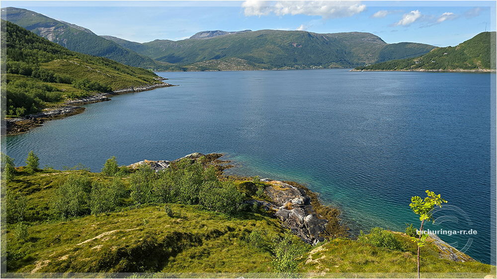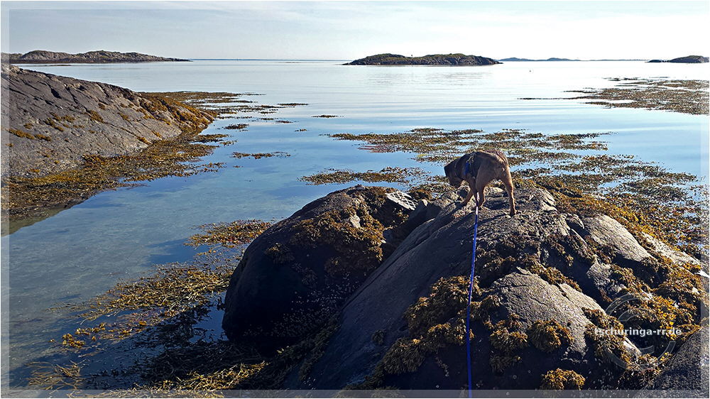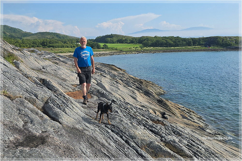 Wir fahren zurück nach Bodø, nutzen die Entsorgung noch einmal und dann geht es langsam wieder Richtung Süden. In gut einem Monat wollen wir wieder in Deutschland sein. Wir parken auf dem Parkplatz am Kystriksveien kurz hinter der Kjellingstraumenbru. Nach dem Mittagessen erkunden wir die Halbinsel. Viel laufen kann man zwar nicht, aber die Aussicht ist schon genial. Wir entscheiden, dass wir bleiben, obwohl es noch recht früh ist. Das Wetter ist spitze. Friedbert sitzt draußen und ich backe einen Apfelkuchen. Der Tag ist also ausgefüllt. |