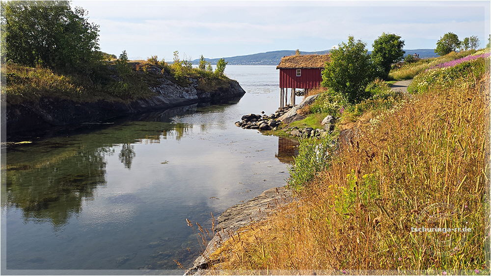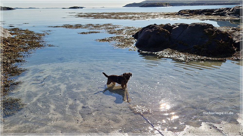 Wir starten nach Steinvikholmen, einer spätmittelalterlichen Insel- und erzbischhöflichen Kirchenburg. Auf dem Parkplatz kann man für 200 NOK übernachten. Es gibt allerdings nichts, außer der Möglichkeit zum Parken. Egal, es ist so schönes Wetter und wir stehen direkt an einem Ausläufer des Trondheimfjords. Was will man mehr? Wir laufen einmal um die Burganlage und anschließend entlang des Fjords. Die Burganlage besichtigen wir allerdings nicht. Den Nachmittag verbringen wir vor dem Womo in der Sonne mit Blick auf den Fjord. Während wir vor dem Wohnmobil sitzen, hören wir immer wieder lautes Geschrei von Seevögeln. Als ich mit Una eine kleine Runde drehe, sehe ich sie, die Austernfischer. Una wird gegen die Canon umgetauscht und ich geh noch mal los. Abends wird der neue Grill getestet. Um 20:30 Uhr starten wir zu einer zweiten Runde über die Insel. So langsam kommt das Wasser näher und die Steine unterhalb der Wohnmobile verschwinden zunehmend in der Flut. |