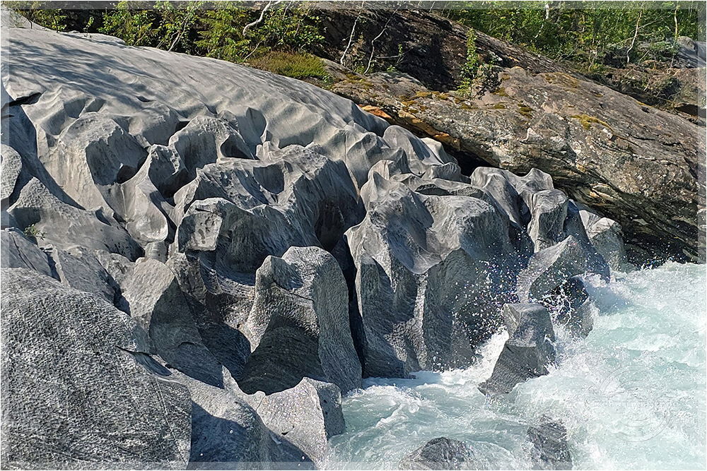 Heute Morgen müssen wir in Mo i Rana zuerst mal einige Dinge erledigen. Einkaufen, entsorgen, Wasser und Diesel tanken. Gas könnten wir tanken, aber die Flaschen sind noch fast voll. Das lohnt sich nicht. Seit wir keinen Gaskühli mehr haben, brauchen wir erheblich weniger Gas und heizen muss man zur Zeit nicht wirklich. Dann geht es weiter zum Marmorslottet. Das Navi hat mal wieder so seine eigenen Ideen und führt uns in ein Abbaugelände. Also umdrehen und neu suchen. Irgendwann kommen wir aber tatsächlich auf dem richtigen Parkplatz an. Nach Mittag starten wir über einen steinigen und mit Brettern ausgelegten Weg, der irgendwann in einer Kletterpartie endet. Um runter auf den "Marmor" zu kommen, müssen wir über große Felsbrocken turnen. Die Hunde machen das super mit. Una ist sehr vorsichtig, Lennox muss schon mal gebremst werden, weil er immer schnell hinter mir her will. Ist Friedbert mit ihm alleine unterwegs, ist er bedeutend vorsichtiger. An einer Stelle müssen wir die beiden heben, weil Springen zu gefährlich wäre und zumindest Una sich auch weigert, da runter zu gehen. Aber besser so als anders. Nach der Rückkehr gibt es ein superleckeres Schoko-Pistazien Eis, das uns heute Morgen im Kiwi angegriffen hat und zur Strafe mit musste. Während wir das schlemmen, kommt ein kleiner Gewitterschauer runter und spült das Wohnmobil mal etwas sauber. 70 NOK haben wir für 24 Stunden parken bezahlt, also bleiben wir heute hier. |