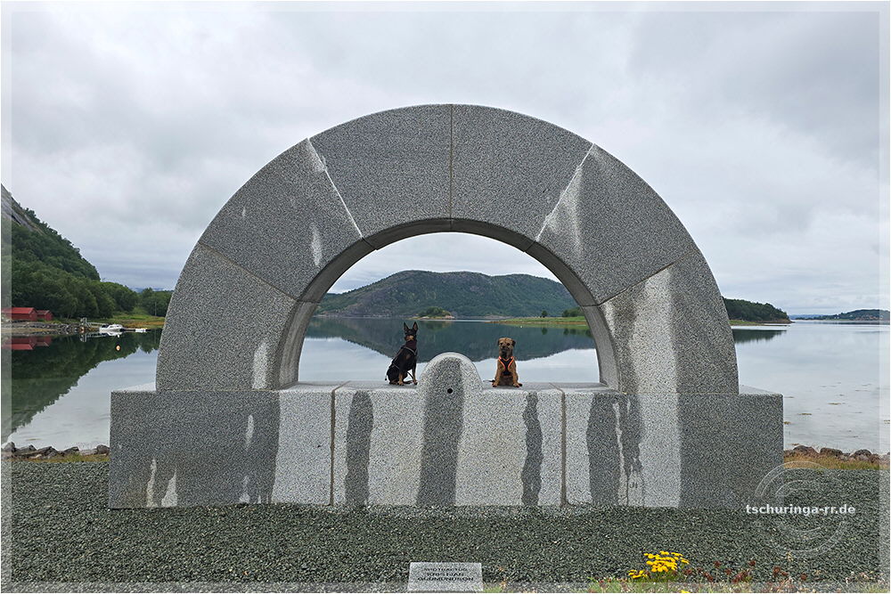 Heute Morgen fahren wir zurück nach Mo i Rana, wo wir einkaufen, entsorgen und Wasser tanken wollen. Das mit dem Wasser tanken klappt nicht. Der Wasserkran braucht einen "Schlüssel", einen "Nøkkel", damit man den Kran öffnen kann. Friedbert geht in die Tankstelle und fragt nach. Leider ist der "Nøkkel" abhanden gekommen. Kurz entschlossen wollen wir uns selber einen zulegen. Im dritten Versuch klappt das dann auch. Als wir an die Tankstelle zurück kommen, steckt der nicht vorhandene "Nøkkel" am Wasserhahn. Nachdem wir endlich Wasser haben, ist es schon spät und wir fahren auf den Platz, wo wir am Sonntag waren, um erstmal Mittag zu essen. Noch eine Nacht wollen wir aber hier nicht verbringen. So schön war es dann doch nicht. Wir fahren weiter Richtung Polarkreis und halten am Arctic Circle Center an, besuchen den Souvenirshop und laufen ein paar Meter den Berg hinauf. Es ist aber wieder so heiß, dass wir uns eine größere Wanderung sparen. Wenn schon Lennox wie verrückt hechelt ... Das Wetter soll wieder schlechter werden und deshalb mussten wir heute noch ein Eis mitnehmen. Das vernichten wir im Wohnmobil. Abends laufen wir noch eine schöne Runde mit den Hunden am Polarkreis-Center. Die Temperatur ist jetzt erheblich angenehmer als am Nachmittag. |