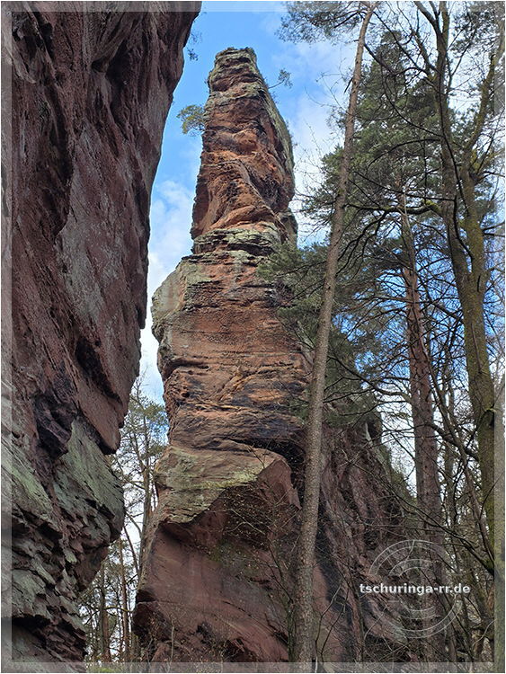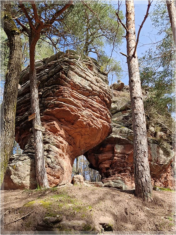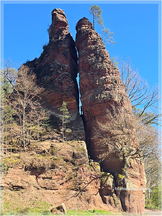| "Braut und Bräutigam" sind die markantesten Felsensäulen im Dahner Felsenland. | ||