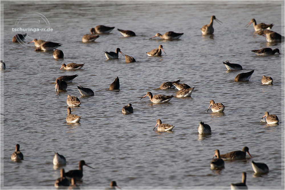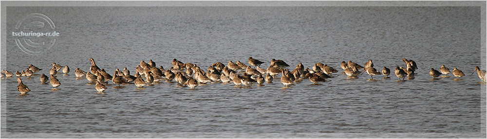 | Eine ganze Sandbank voll Uferschnepfen | ||